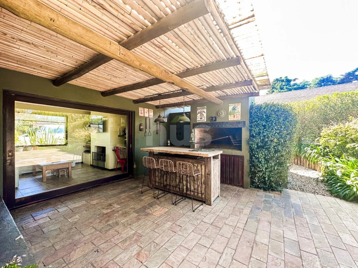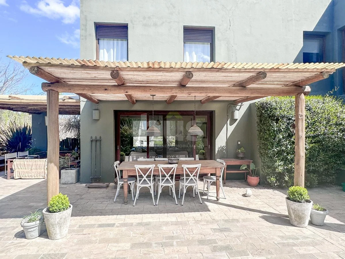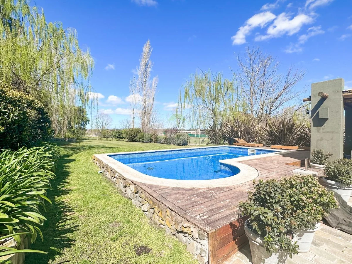 Pérgola techada con parrillero y barra, otra pérgola con vista a jardín y piscina con deck.