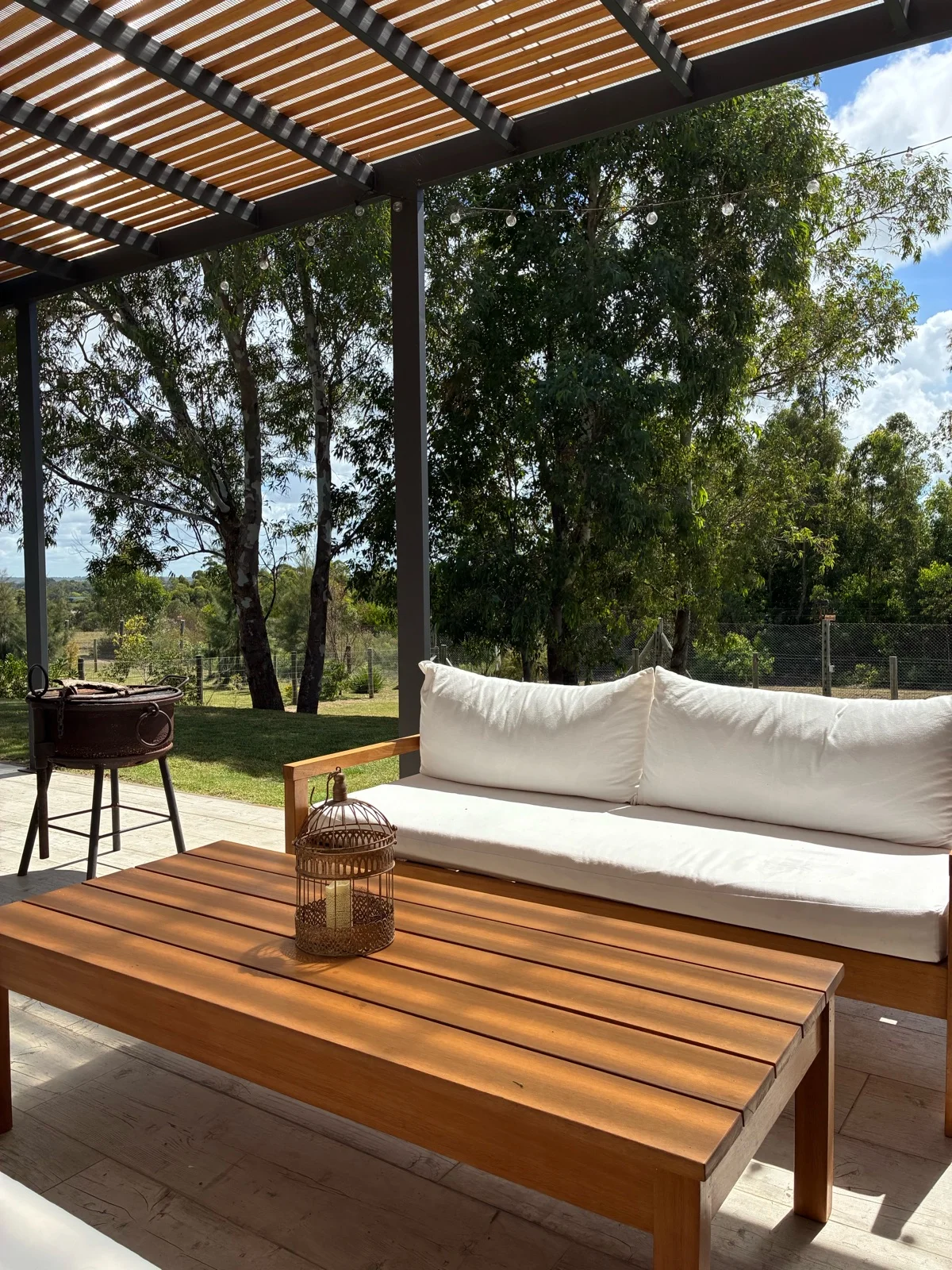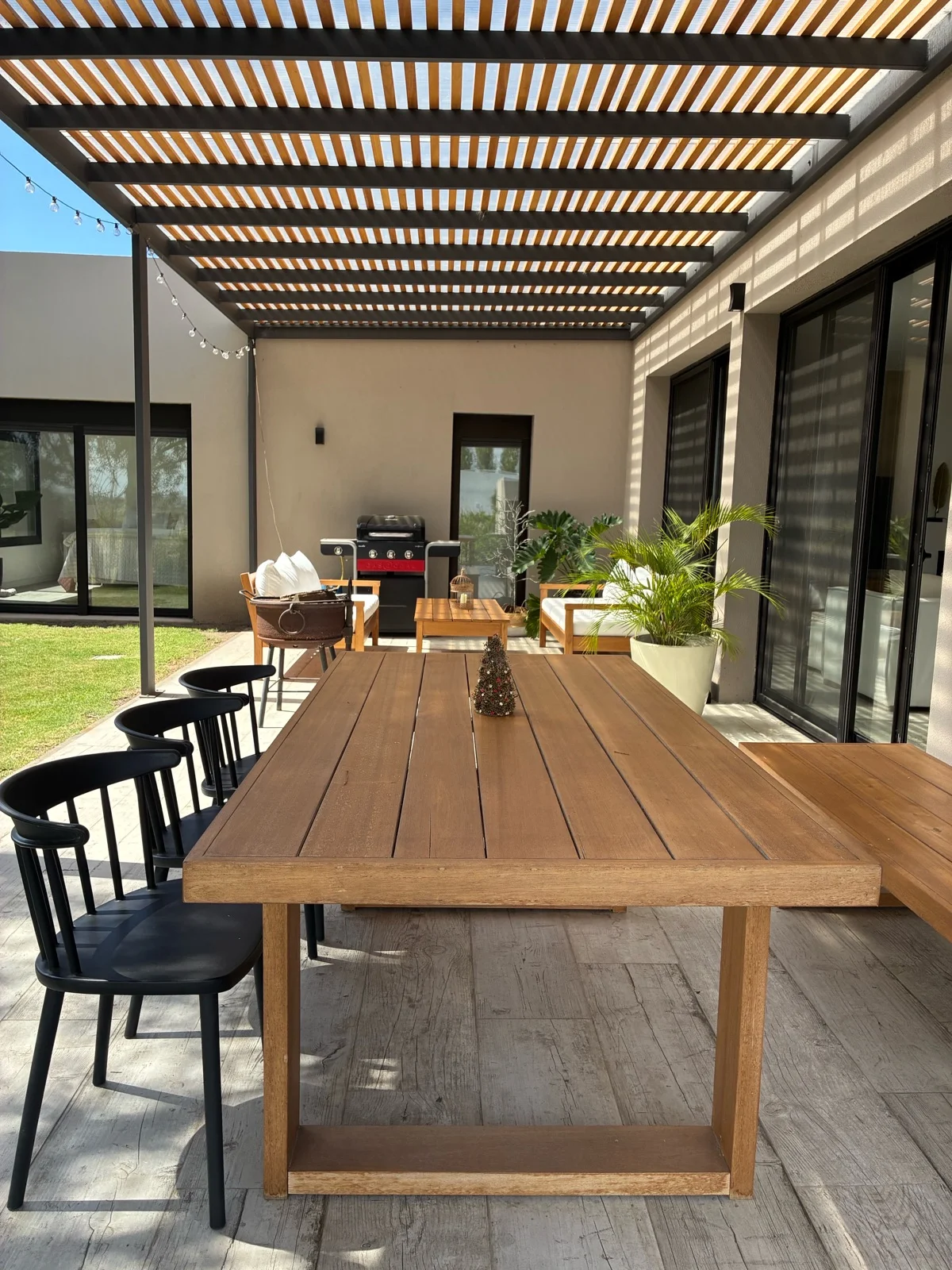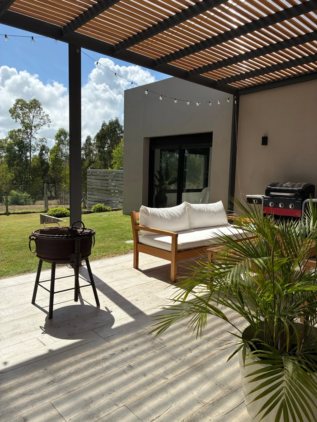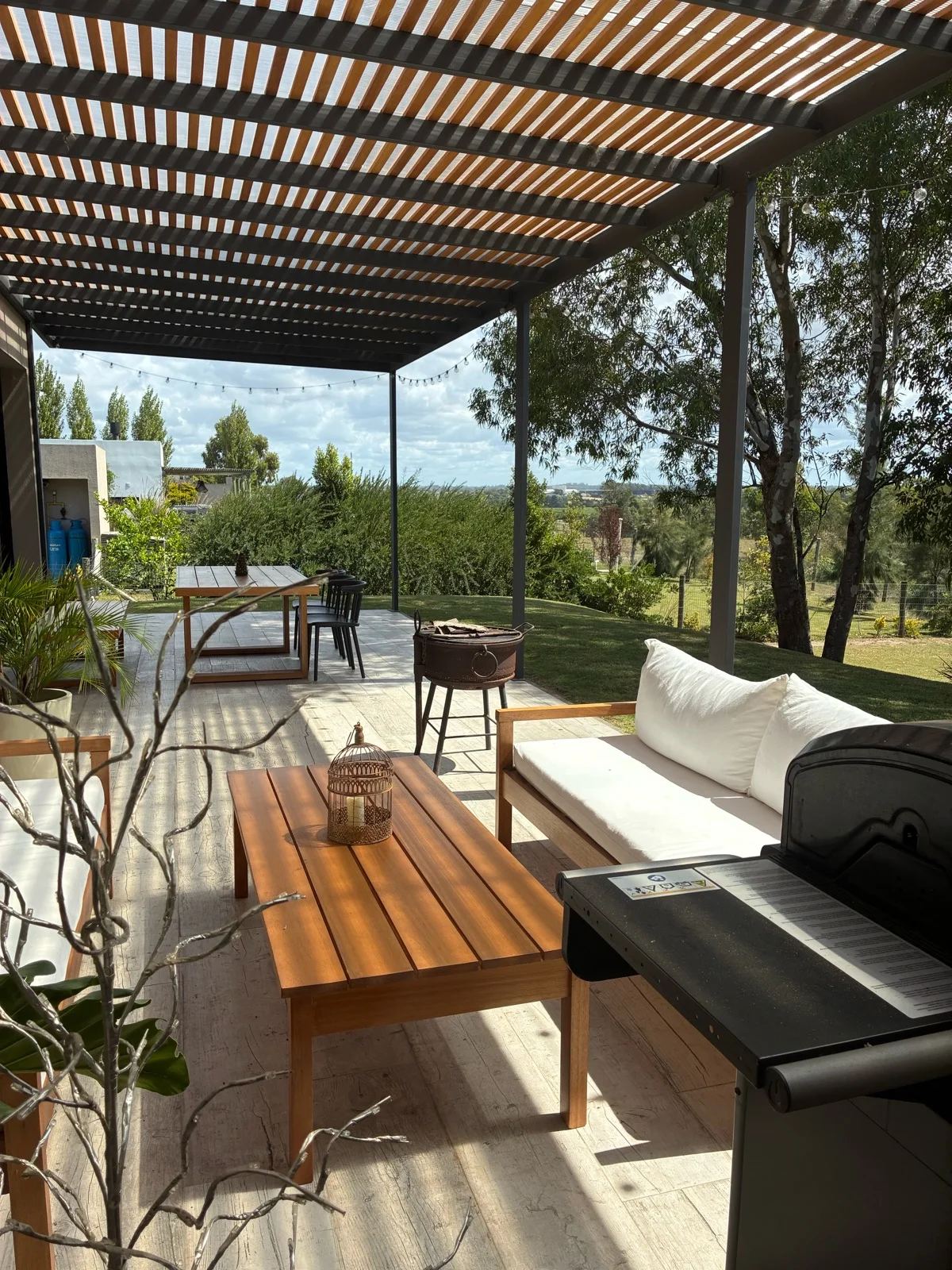 Cuenta con gran pérgola techada de hierro con alfajías de madera y fondo con orientación norte y vista despejada al bosque. Gran jardín.