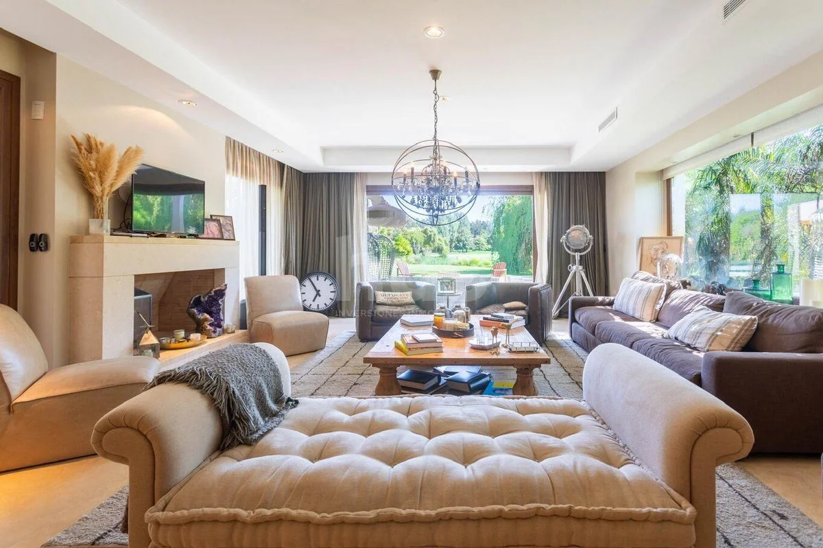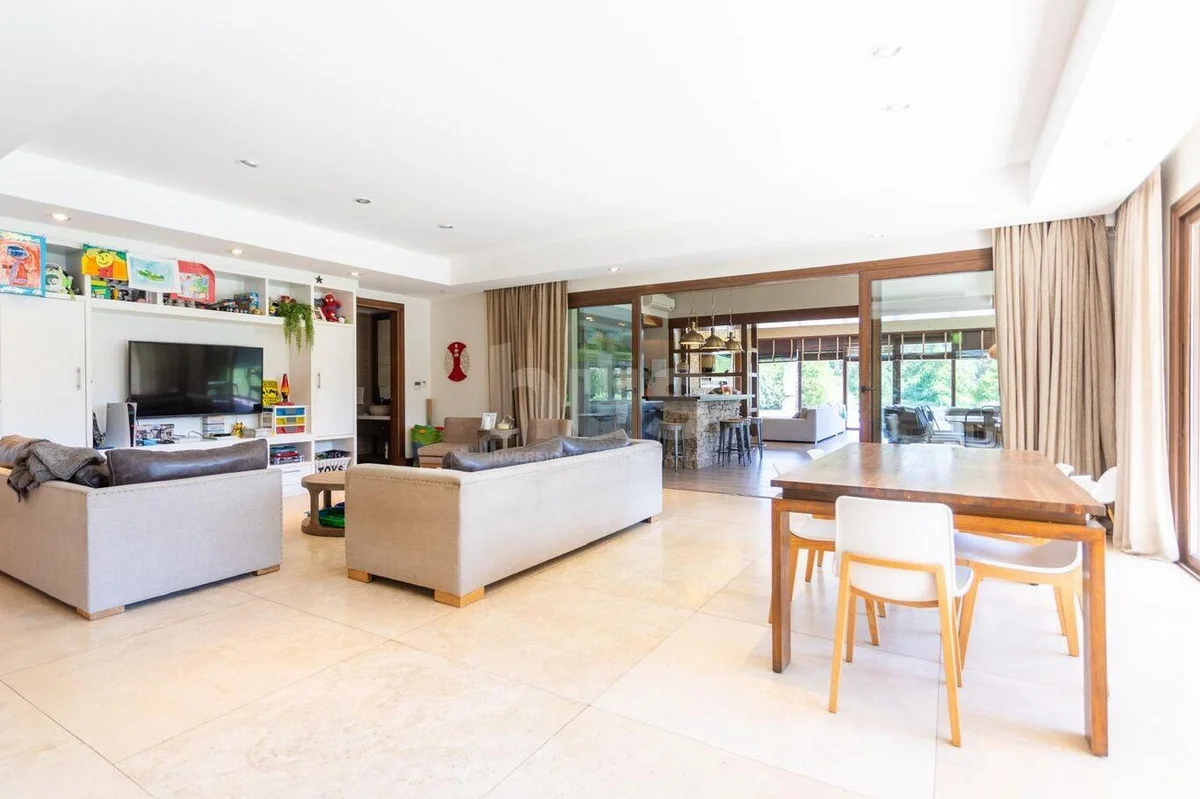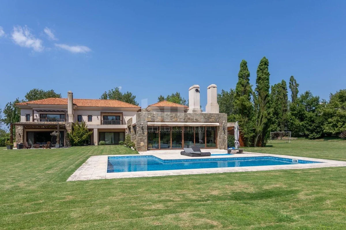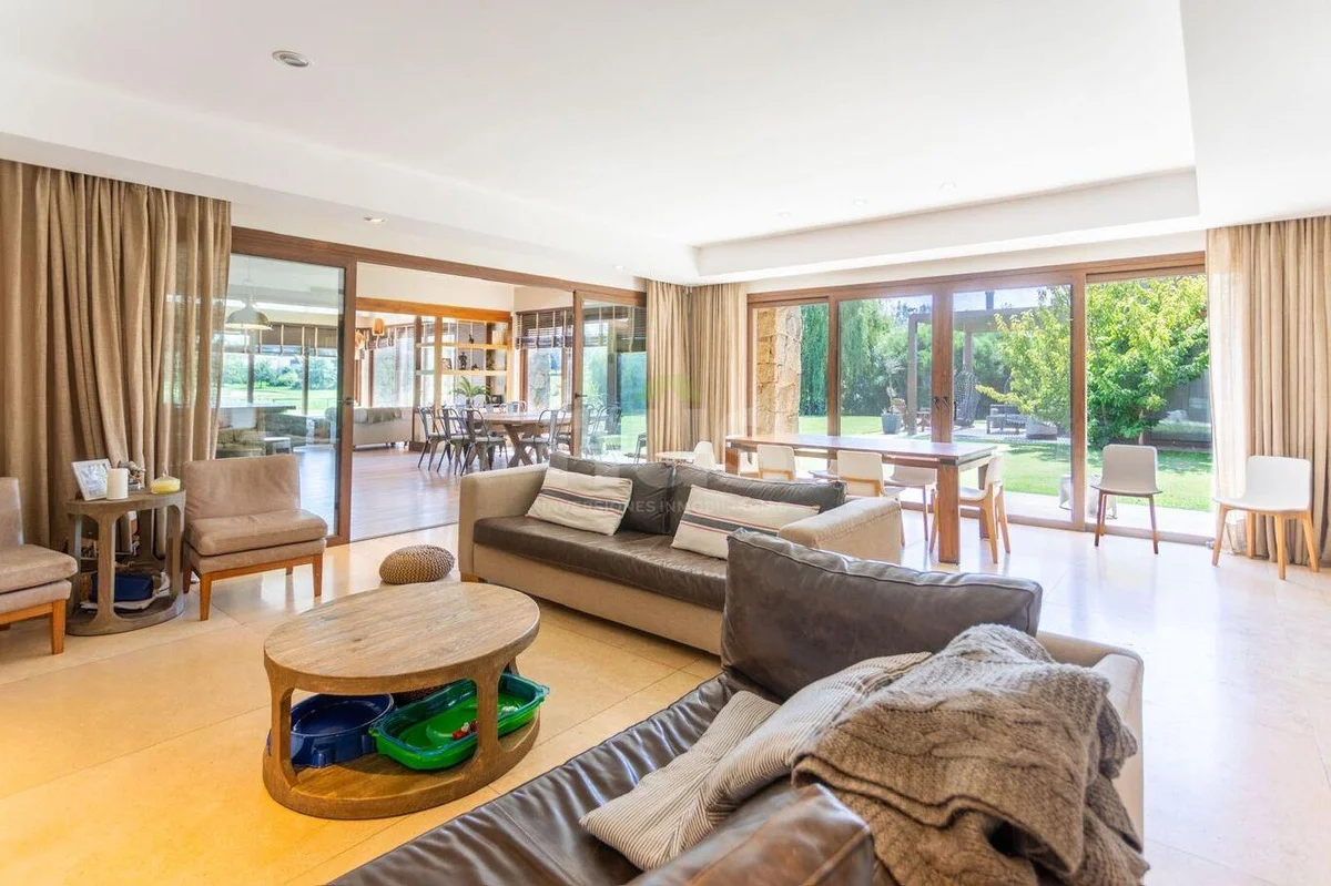 Living con estufa tradicional de gran tamaño que comunica con amplios ventanales a pérgola techada con vistas al jardín/lago, baño social, y elegante comedor independiente.