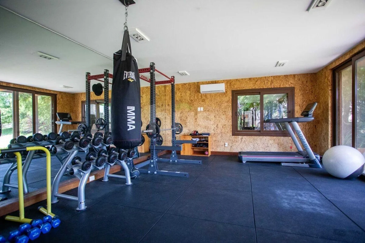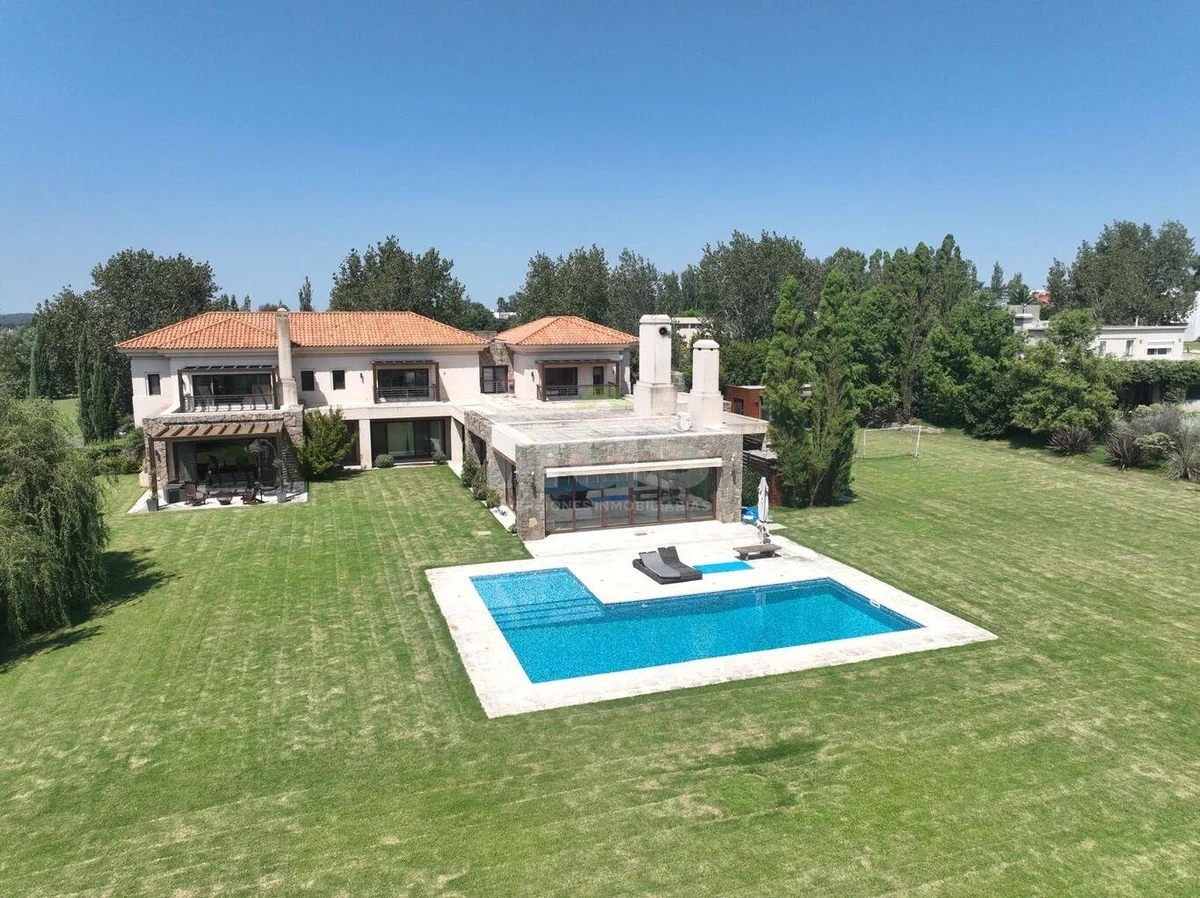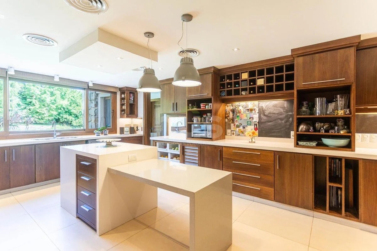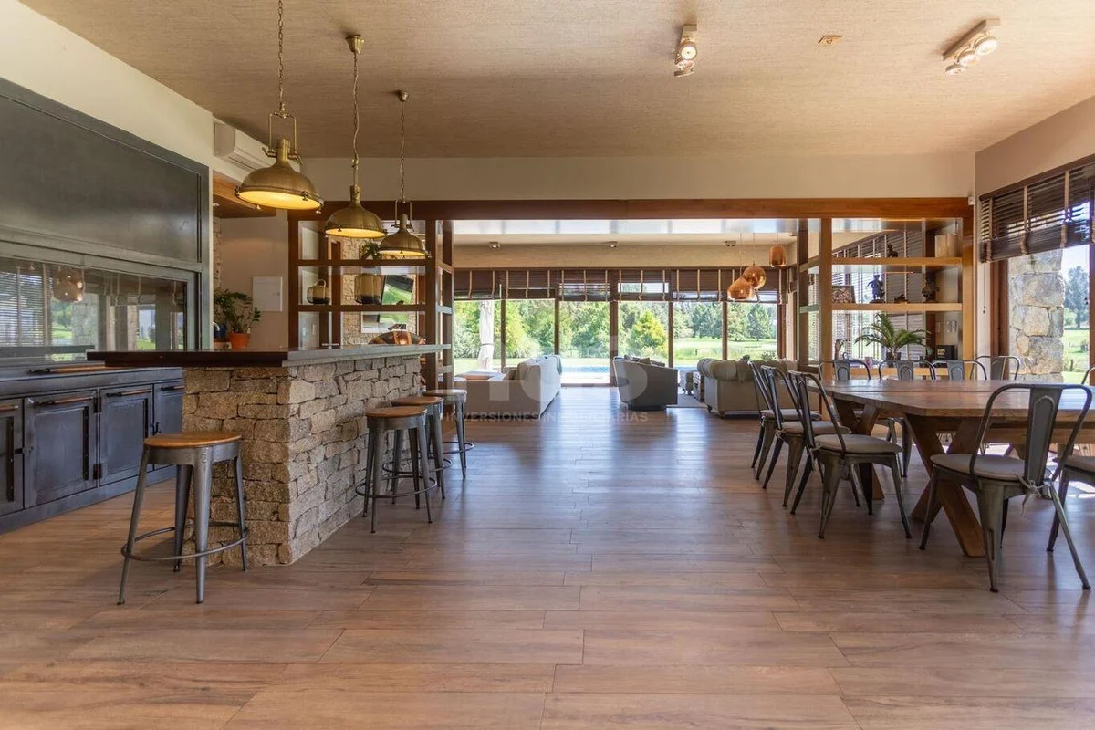 Amplio parrillero cerrado con barra, ventanales con vistas a la piscina y jardín.