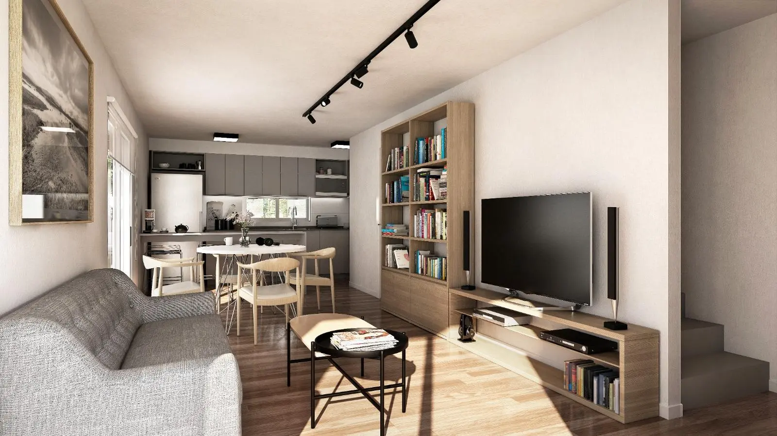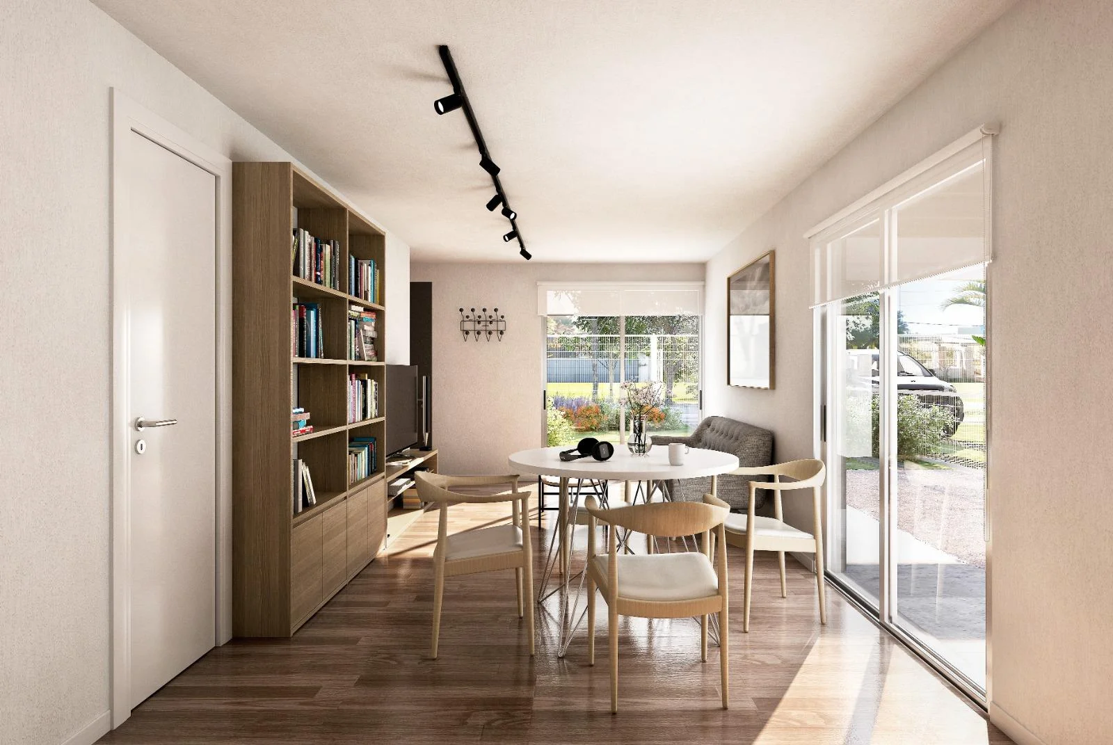 Living comedor (3.00 x 6.00 m): Espacioso y luminoso, con doble ventanal que conecta con el patio y genera un ambiente cálido y aireado.