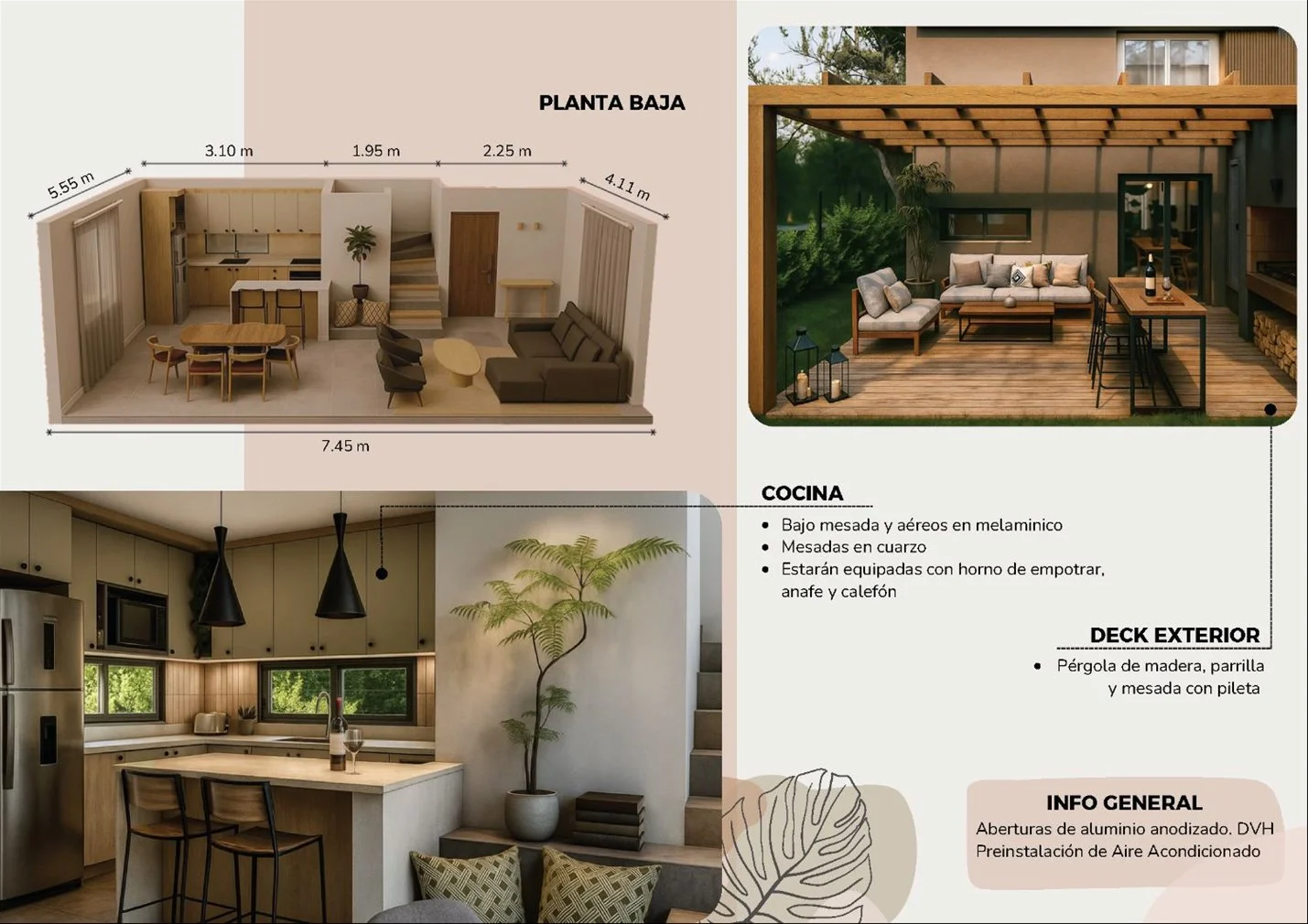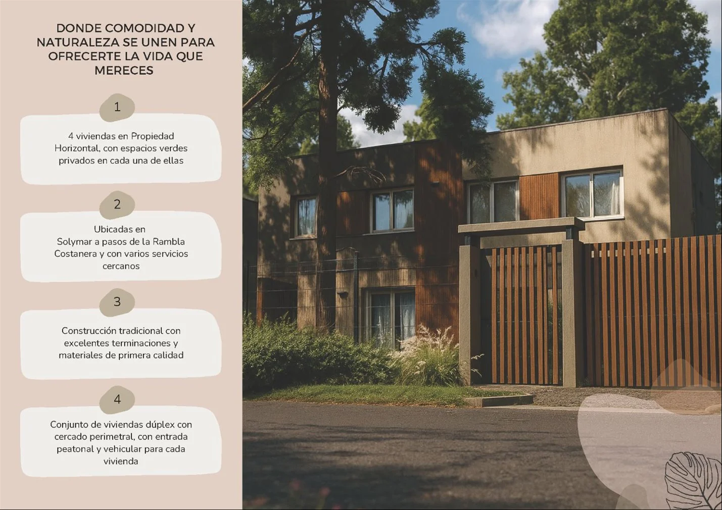CALA Solymar. Proyecto de 4 viviendas tipo dúplex en propiedad horizontal, ubicadas en Solymar, a pasos de la Rambla Costanera y con varios servicios cercanos.Construcción tradicional con excelentes terminaciones y materiales de primera calidad, con espacios verdes privados, cochera, cercado perimetral con entrada peatonal y vehicular (con acceso por control remoto) para cada vivienda.Casa 1 y 2 disponibles.Distribución: 89m2 de vivienda | 196m2 de terreno totalPlanta baja:- Living-comedor con ventanales que aportan gran luminosidad. Estufa de alto rendimiento incluida.- Cocina integrada con mesada de cuarzo, placares bajo mesada y aéreos en melamínico. Equipadas con horno empotrado, anafe y campana.Deck exterior con pérgola de madera, parrillero y mesada con piletaAmplio jardín (frontal y trasero) de uso privadoPlanta alta:- 3 dormitorios equipados con placares de piso a techo - 2 baños completos (uno en suite) con mueble lavatorio, mesada de cuarzo y artefactos y accesorios de excelente calidadCaracterísticas:- Vidrios DVH - Aberturas de aluminio anodizado- Pre instalación para aire acondicionado Split en living-comedor y dormitorios.Beneficios fiscales bajo el régimen de Vivienda Promovida (Ley 18.795): Exento de ITP para compradores iniciales, Exento de IRAE, IRPF e IRNR sobre renta obtenida durante 10 años, Exento del Impuesto al Patrimonio por 10 años.Gastos de ocupación: 2%Fecha estimada de entrega: primavera de 2026. (CW242801)