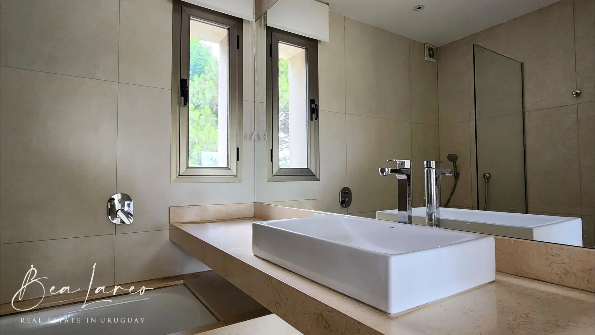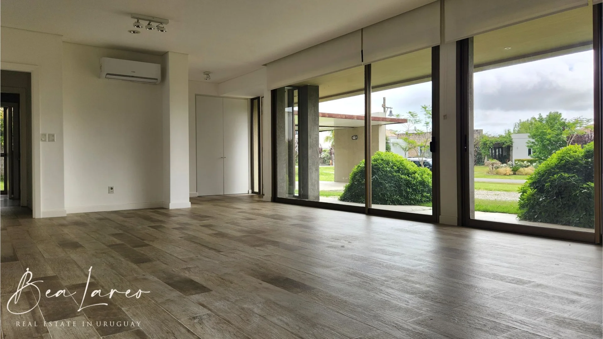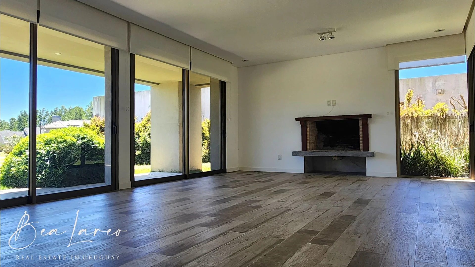 Bright minimalist-style house located in the exclusive private neighborhood of Viñedos de la Tahona. It features 270 sqm of living space on a 1,224 sqm lot. The ground floor includes an entrance hall, a spacious living-dining area with large windows and a wood-burning stove, a family room with access to a large terrace with a barbecue, a guest bathroom, a large fully-equipped kitchen, a service bedroom with en-suite bathroom, and a laundry room. Upstairs the house offers 3 bedrooms with floor-to-ceiling windows, all opening to a lovely terrace: the master suite, and two bedrooms that share a bathroom. There is also an office space. The house is equipped with gas underfloor heating, additional air conditioning, and water heaters. The property features a well-maintained garden and a covered garage for two cars.