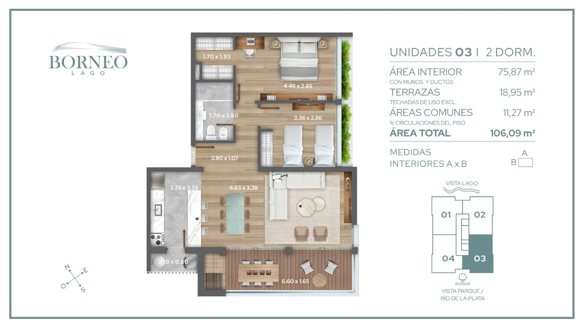 Corredor Responsable: - Contacto: Valentina Marrochi APARTAMENTO 2 DORMITORIOS – CARLOS RACINE - CIUDAD DE LA COSTA Entrega MAYOL 2026 – Últimas unidades disponibles Borneo Lago es un proyecto moderno, ubicado entre el Parque Roosevelt y el Lago Calcagno, pensado para quienes buscan tranquilidad, naturaleza y cercanía a la ciudad. Unidades - cada una de 106 m2 totales: 76 m2 interiores + 11 m2 áreas comunes + terraza de 19 m2 con parrillero - 2 dormitorios, ambos con ventana - Dormitorio principal con vestidor y previsión para 2º baño opcional - Cocina y baño con terminaciones de primera calidad - Grandes ventanales, luz natural todo el día - Incluye 3 aires acondicionados y electrodomésticos de cocina Calidad Aberturas de aluminio con DVH Cortinas automatizadas Pisos ingenieriles de madera Losa radiante eléctrica El edificio Torre de 14 pisos con 4 unidades por nivel. Amenities destacados: - Piscina + solárium en rooftop, vista 360 - Barbacoa - Ascensores de última generación - Cámaras de seguridad - Cerradura digital - Bici parking - Preinstalación para vehículos eléctricos Disponibilidad Precio publicado: Unidad 803 – vista al bosque ÚLTIMAS 4 UNIDADES DISPONIBLES 803 - USD 272.000 (vista boque 3) 902 – USD 345.000 (vista lago 2) 1103 – USD 282.000 (vista bosque 3) 1303 - USD 285.000 (vista bosque 3) Gastos Comunes $9.000 Garajes USD 29.000 Formas de pago 10% seña 20% compromiso 70% entrega 5% gastos de conexión Acepta préstamos hipotecarios Beneficios – Vivienda Promovida Exoneración ITP Exoneración IVA Exoneración IRPF rentas por 10 años Exoneración Impuesto al Patrimonio Borneo Lago es una propuesta para vivir distinto, en plena conexión con la naturaleza. ¡Coordinemos una visita a la obra! COMISION INMOBILIARIA 3% MAS IVA SOBRE PRECIO DE VENTA Cada Oficina es de propiedad, gestión y desarrollo independiente La presente publicación describe las características esenciales del inmueble, debiéndose consultar al responsable de la operación por la eventual actualización de las medidas, descripciones arquitectónicas y funcionales, servicios, impuestos, precios y demás información, cuyos valores son aproximados. Cada Oficina es de propiedad, gestión y desarrollo independiente La presente publicación describe las características esenciales del inmueble, debiéndose consultar al responsable de la operación por la eventual actualización de las medidas, descripciones arquitectónicas y funcionales, servicios, impuestos, precios y demás información, cuyos valores son aproximados.