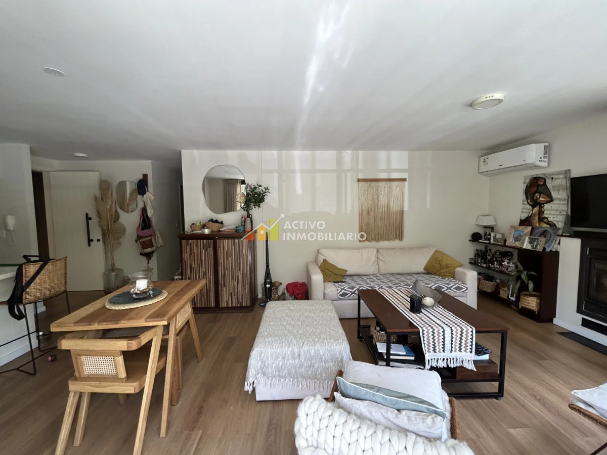 - Living comedor con estufa y grandes ventanales que dan acceso a la terraza con parrillero.