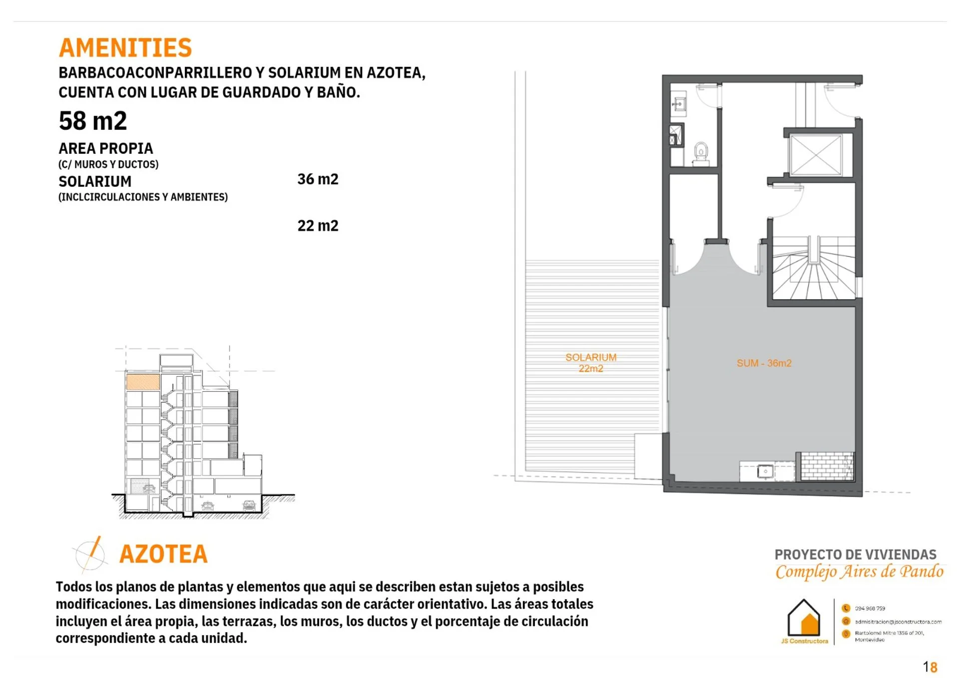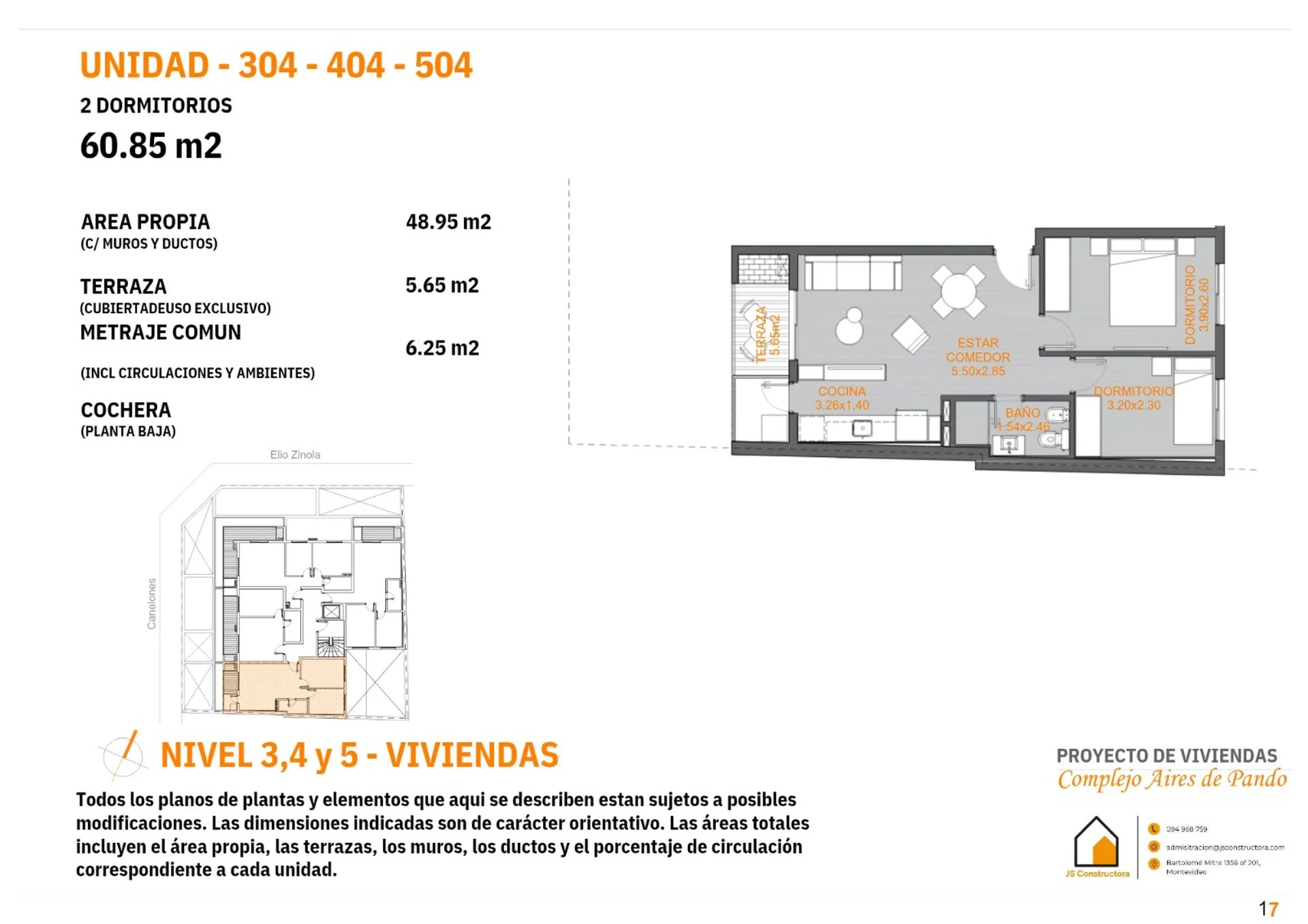 Corredor Responsable: - Contacto: Marcelo Sebastián Sosa Santos Venta apartamento 2 dormitorios en Aires Pando Se vende en exclusividad, apartamento en pozo, complejo Aires de Pando. Ubicado a tan solo 4 cuadras de la Plaza Constitución y a escasas 3 cuadras de la Ruta 8, en un punto estratégico de la ciudad con fácil acceso y egreso tanto hacía Montevideo, como hacía el este. El complejo Aires de Pando comienza sus obras el próximo año 2026, tiene fecha prevista de entrega a fines del año 2027, es una torre con 2 locales comerciales y 20 apartamentos de uno, dos y tres dormitorios, ascensor, cocheras en planta baja y subsuelo y barbacoa con solarium en el roof top. Finas terminaciones, construcción tradicional, ley de vivienda promovida que exonera del ITP en la compra, IVA y Patrimonio de corresponder y también exonera al inversor de pagar IRPF sobre el alquiler durante 10 años, todo esto lo hace un producto muy atractivo para invertir en pozo y adquirir estas unidades a un precio super promocional, gran rentabilidad sobre la inversión, es un producto único. Gastos comunes calculados en aproximadamente $ 3.000.- por mes. La unidad 304 se ubica sobre la calle Manuel Oribe (ex Canelones), sus vistas permitirán disfrutar de hermosos atardeceres con una gran vista despejada, cuenta con 65m² propios de apartamento (living con cocina semi integrada mediante barra, lavadero, baño y dos dormitorios) y gran terraza de 8,4m² con parrillero propio. Precio promocional contado U$S 86.250.- Precio promocional entregando el 20% y luego por avance de obra durante el año y medio de la misma U$S 97.750.- Precio de lista al finalizar la obra U$S 115.000.- Cocheras U$S 6.000.- cada una Gastos de ocupación 3% Consulte por otras unidades. Compartimos con todos los colegas Comisión inmobiliaria 3% más IVA Cada Oficina es de propiedad, gestión y desarrollo independiente La presente publicación describe las características esenciales del inmueble, debiéndose consultar al responsable de la operación por la eventual actualización de las medidas, descripciones arquitectónicas y funcionales, servicios, impuestos, precios y demás información, cuyos valores son aproximados.