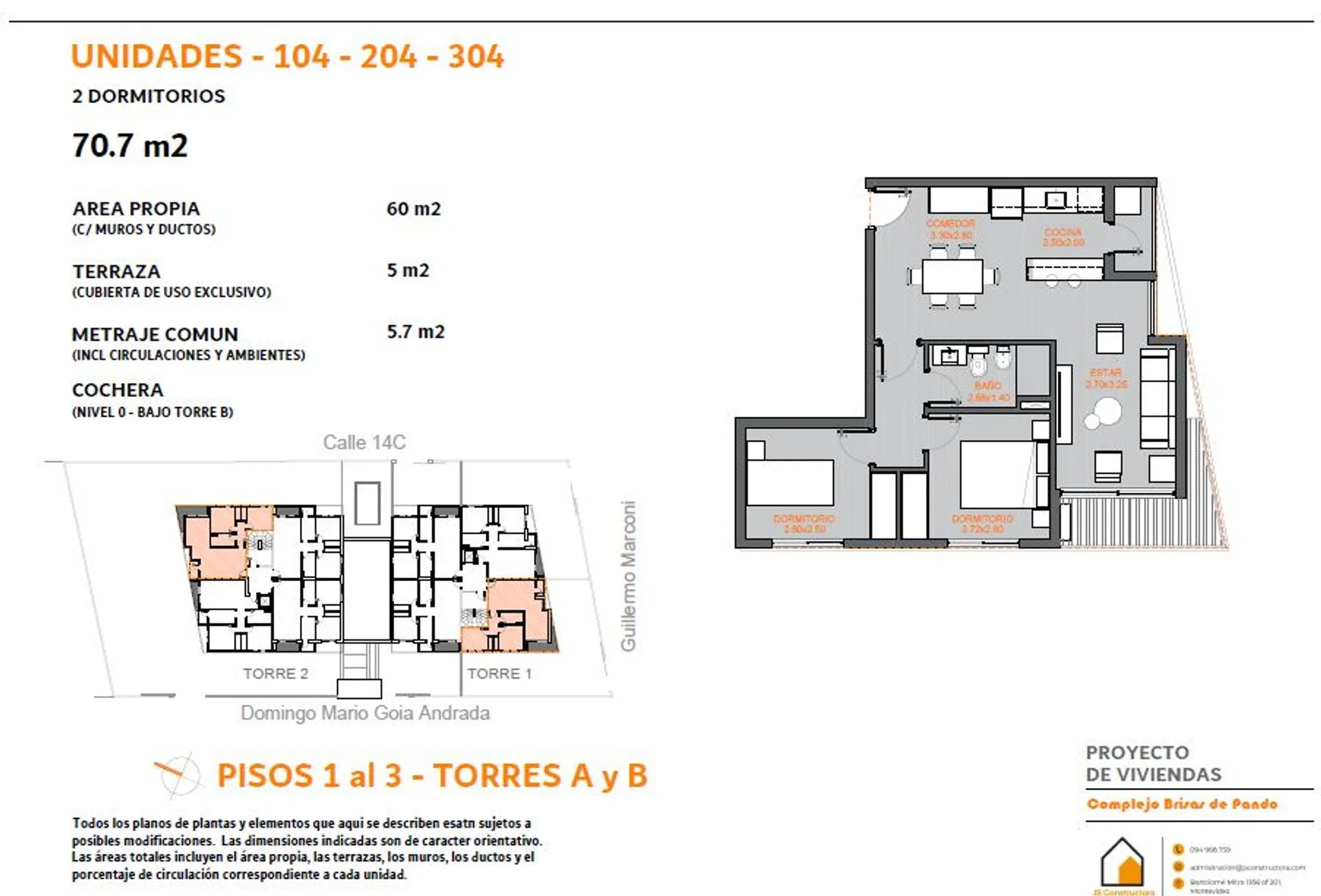 Corredor Responsable: - Contacto: Diego Alonso Se vende apartamento 2 dormitorios, con piscina, barbacoa, gimnasio y solarium en Pando. Este proyecto ubicado sobre la calle Marconi, a tan solo una cuadra de la avenida principal de ingreso a Pando y a tres del By pass de Ruta 101, nos ofrece una excelente ubicación, en un barrio tranquilo “como los de antes”. Se construirán dos torres de apartamentos con Amenities en planta baja entre medio de ambas torres y en el roof top de cada una de ellas. Es un proyecto innovador para la ciudad, que viene a brindar una opción hasta ahora desconocida para los habitantes, pero muy requerida en la zona. Ubicado en un punto tranquilo de la ciudad con fácil acceso y egreso tanto hacía Montevideo, como hacía el este. El complejo Brisas de Pando comienza sus obras en el año 2026, tiene fecha prevista de entrega en Diciembre de 2027, son dos torres de edificios, en total 28 apartamentos de uno y dos dormitorios, ascensor en cada torre, cocheras, piscina, parrillero en planta baja, gimnasio y barbacoas con solarium en azoteas. Predio cerrado con circuito de videovigilancia. Finas terminaciones, construcción tradicional, ley de vivienda promovida que exonera del ITP en la compra, IVA y Patrimonio de corresponder y también exonera al inversor de pagar IRPF sobre el alquiler durante 10 años, todo esto lo hace un producto muy atractivo para invertir en pozo y adquirir estas unidades a un precio super promocional, rentabilidad del 20% sobre la inversión, es un producto único. El apartamento disponible es el 304, ubicado en un tercer piso de la torre A. La unidad tiene una superficie de 60m², con una distribución funcional. Cuenta con dos dormitorios, cocina, living, baño y todos los ambientes definidos, además de una terraza de 5 m². Ofrece una vista despejada, excelentes terminaciones, y aberturas con doble vidrio que aseguran aislamiento térmico y acústico. Es una excelente oportunidad para adquirir un apartamento moderno con los mejores amenities que hay en la zona. Además, existe la posibilidad de adquirir una cochera por USD 3.000. Los gastos comunes que se estiman son de aprox. $ 4.500.- Los gastos de ocupación ascienden al 3%. Opción pago contado U$S 108.900.- Opción por avance de obra (20% de entrega inicial) U$S 119.000.- Consulte por otras unidades. Compartimos con todos los colegas Comisión inmobiliaria 3% más IVA Quedamos a disposición para coordinar entrevista, brindar más información del proyecto, como de la empresa constructora, propuesta de inversiones en pozo, visitas a la zona, etc. Cada Oficina es de propiedad, gestión y desarrollo independiente La presente publicación describe las características esenciales del inmueble, debiéndose consultar al responsable de la operación por la eventual actualización de las medidas, descripciones arquitectónicas y funcionales, servicios, impuestos, precios y demás información, cuyos valores son aproximados.