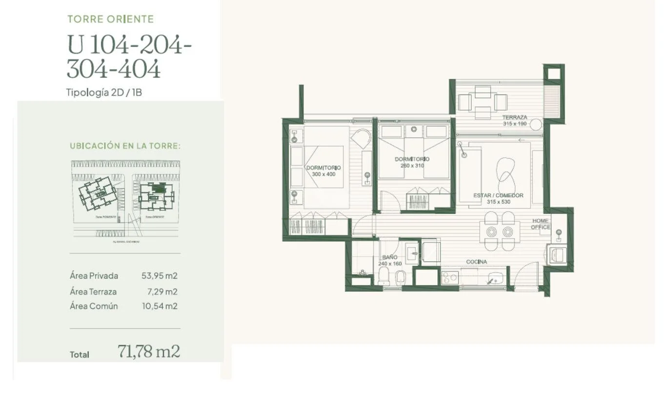 104 a 404) 53,95m2 área privada + 7,29m2 área terraza + 10,54m2 área común = 71,78m2 Totales.
