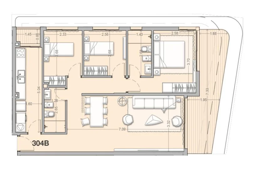 Apartamento con Cocina Integrada a amplio Living Comedor con Barra pasa platos. Salida a Terraza Exclusiva con Parrillero Propio. Baño completo. Dormitorios al Frente con salida a Terraza y Placares.