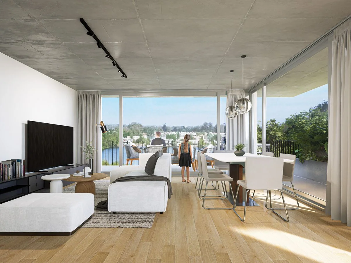Hall recibidor, living comedor con amplia terraza privada con vista al bosque y gran ventanal de piso a techo con vidrios DVH, lo cual le otorga un aislamiento acústico y térmico óptimo, además de gran luminosidad. Cocina integrada por equipada con horno, anafe y campana. Dos dormitorios con acceso a la terraza y un baño completo.