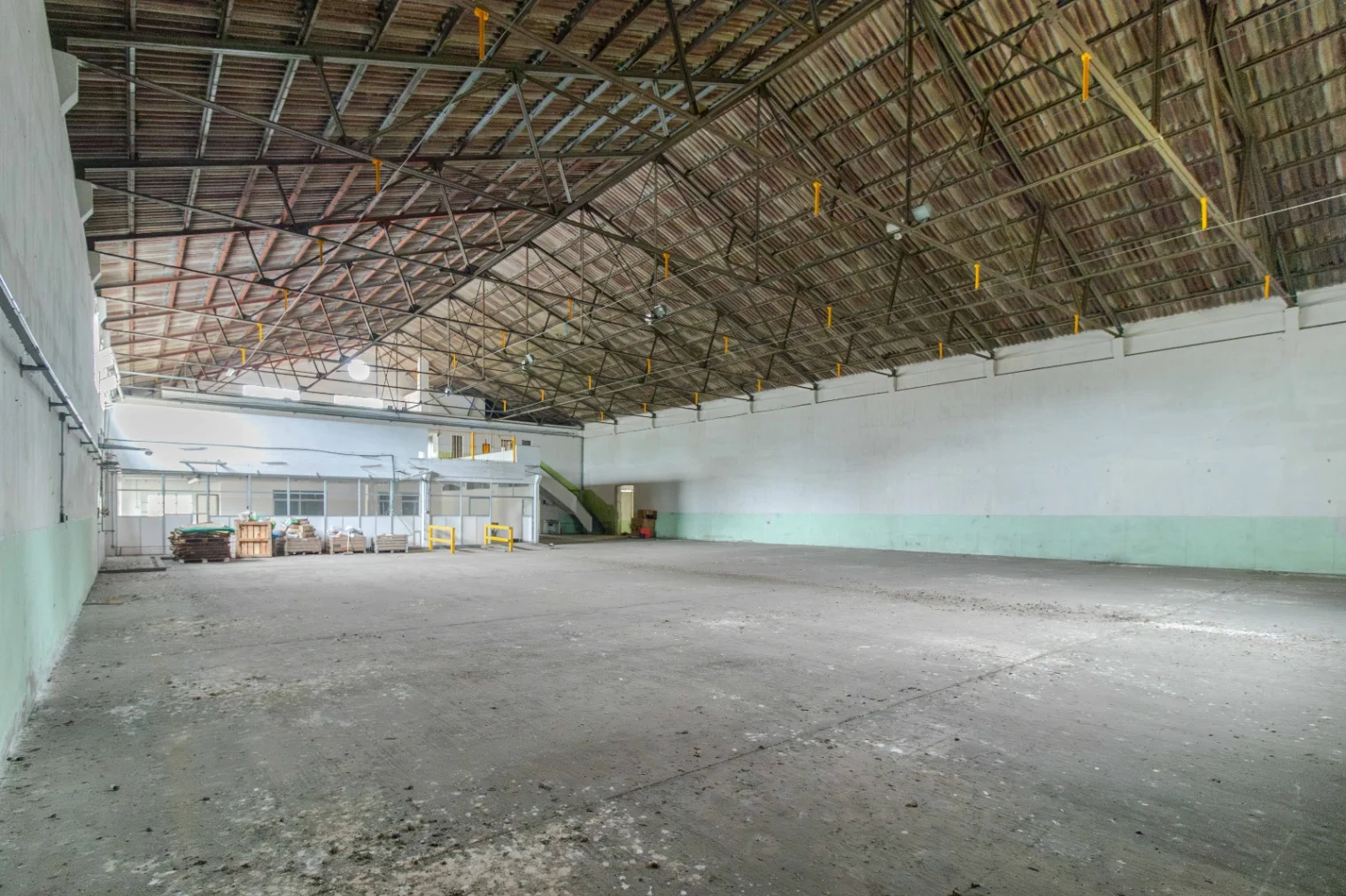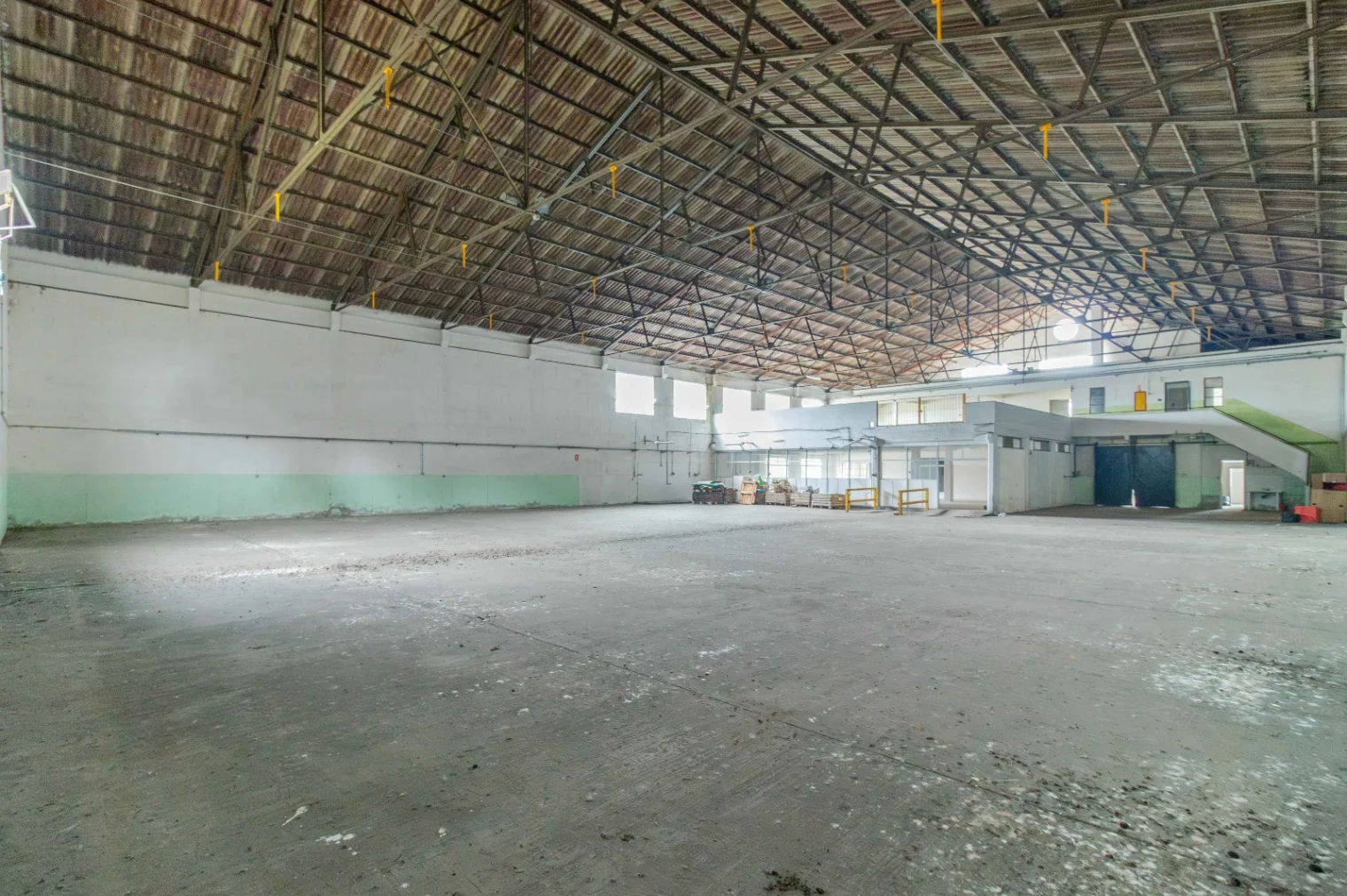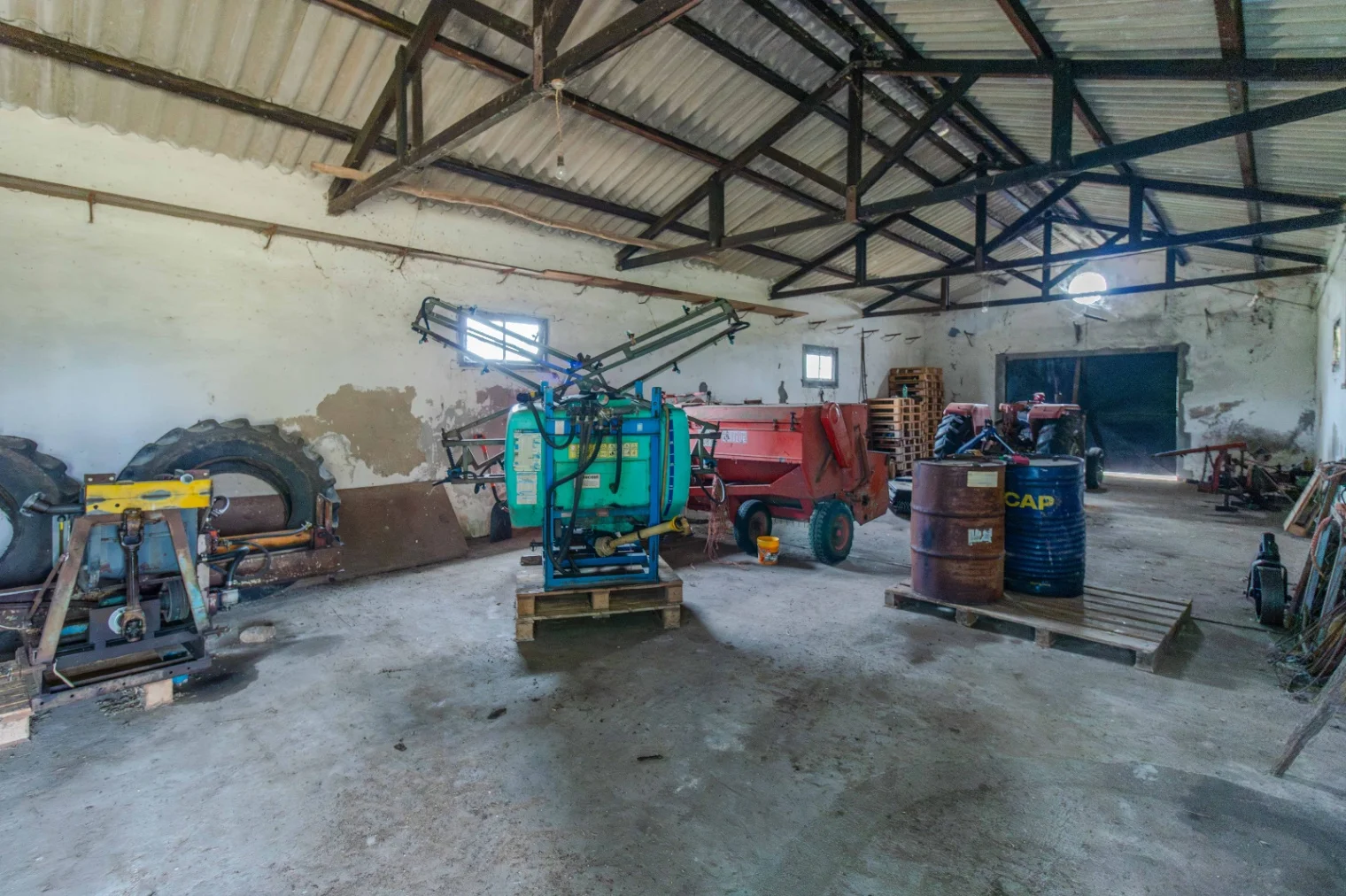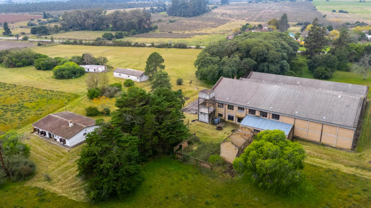 3 naves industriales de construcción tradicional, con techos de cerchas metálicas y cubiertas de chapa. Superficie total: 2.350 m², aptas para depósito, manufactura, logística o actividades agroindustriales.