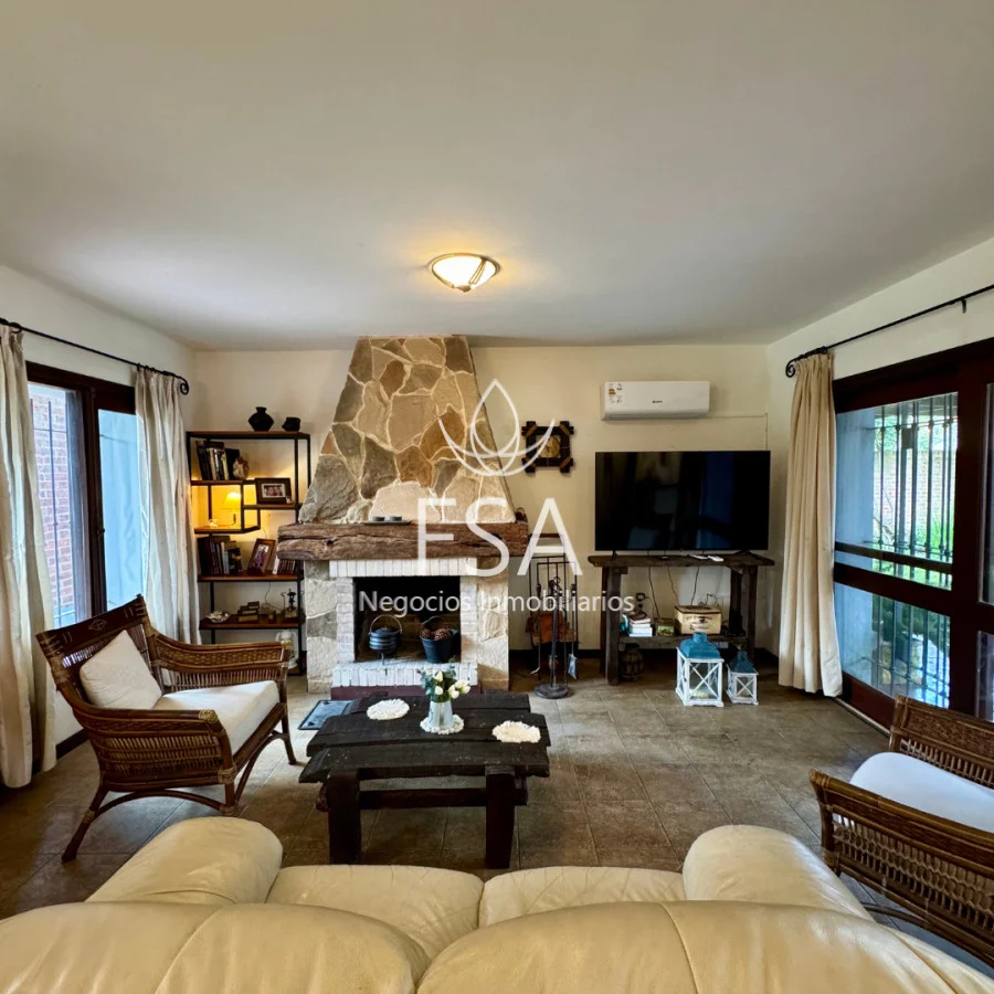 - Living con estufa a leña tradicional, aire acondicionado y ventanales al frente y fondo.