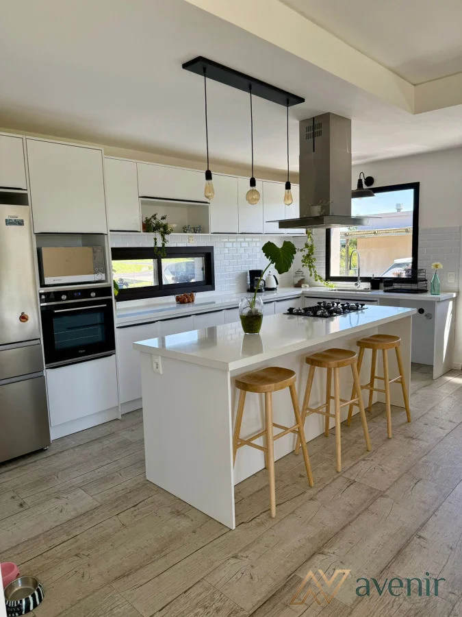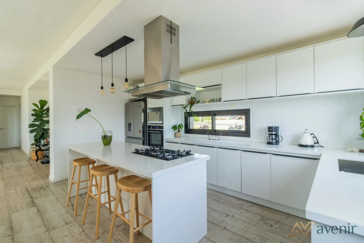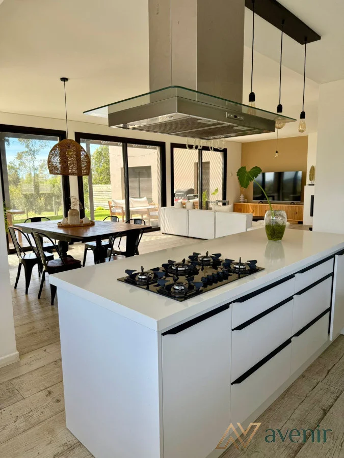 A la izquierda cocina abierta con excelente diseño y practicidad con espacio de lavadero independiente y entrada secundaria por estacionamiento de los vehículos.