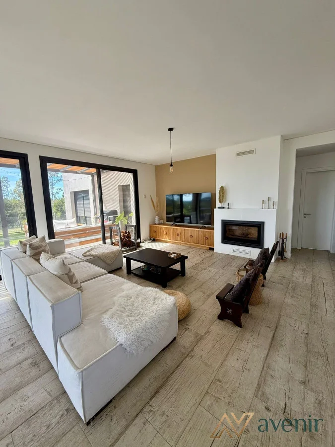 A la derecha se encuentra el living amplio con estufa de alto rendimiento e ingreso a la parte privada de la propiedad con 3 dormitorios amplios con persianas eléctricas, de los cuales uno es en suite con vestidor. Baño completo compartido para los restantes.