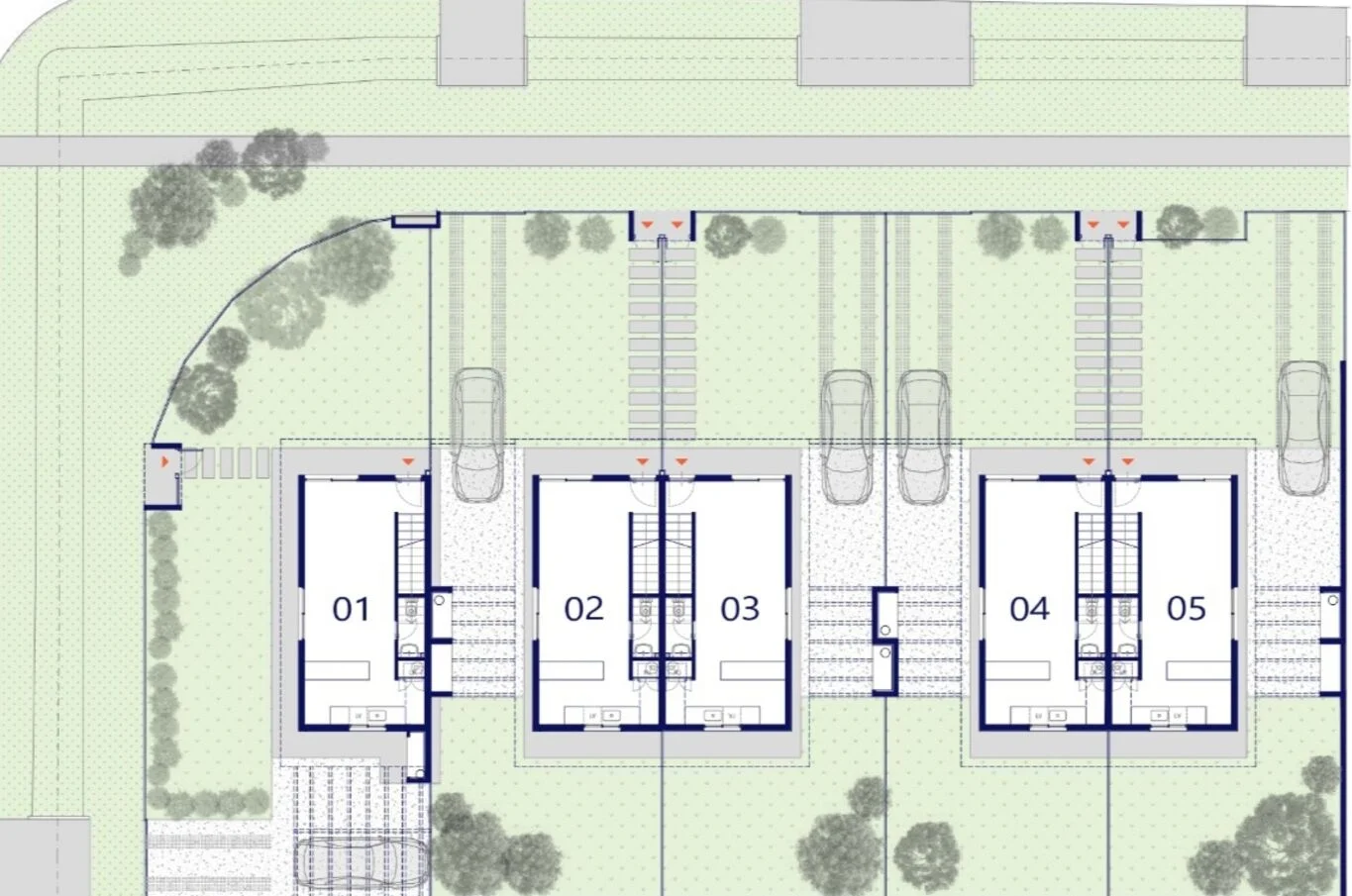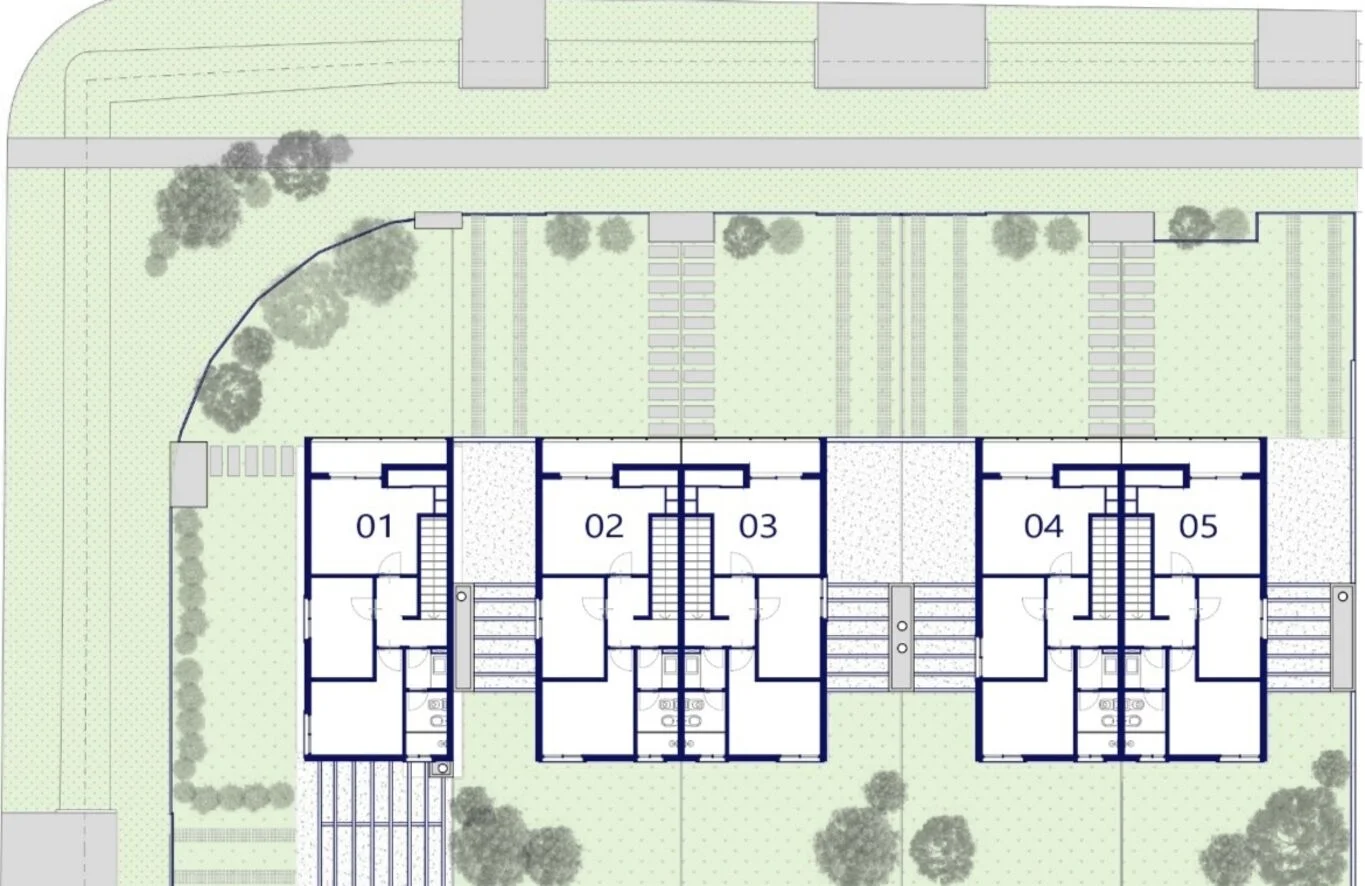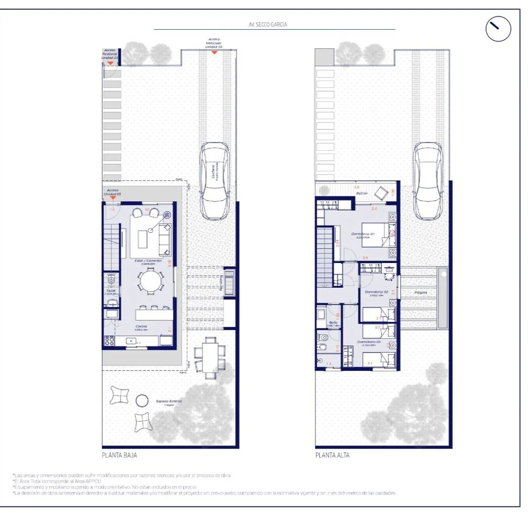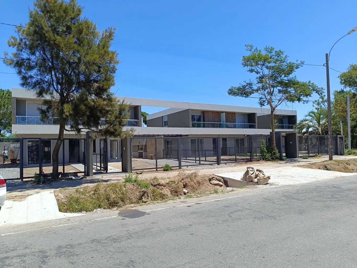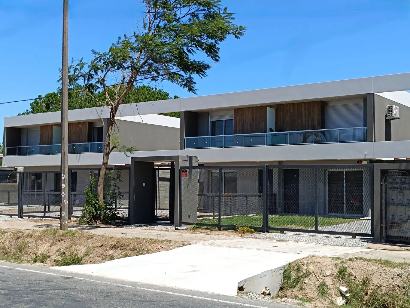Conjunto de 5 casas dúplex de tres dormitorios con acceso individual, jardín y fondo de uso exclusivo. Construcción tradicional de hormigón HCCA, previsión para instalación de aire acondicionado, conexiones para lavavajilla y lavarropas.