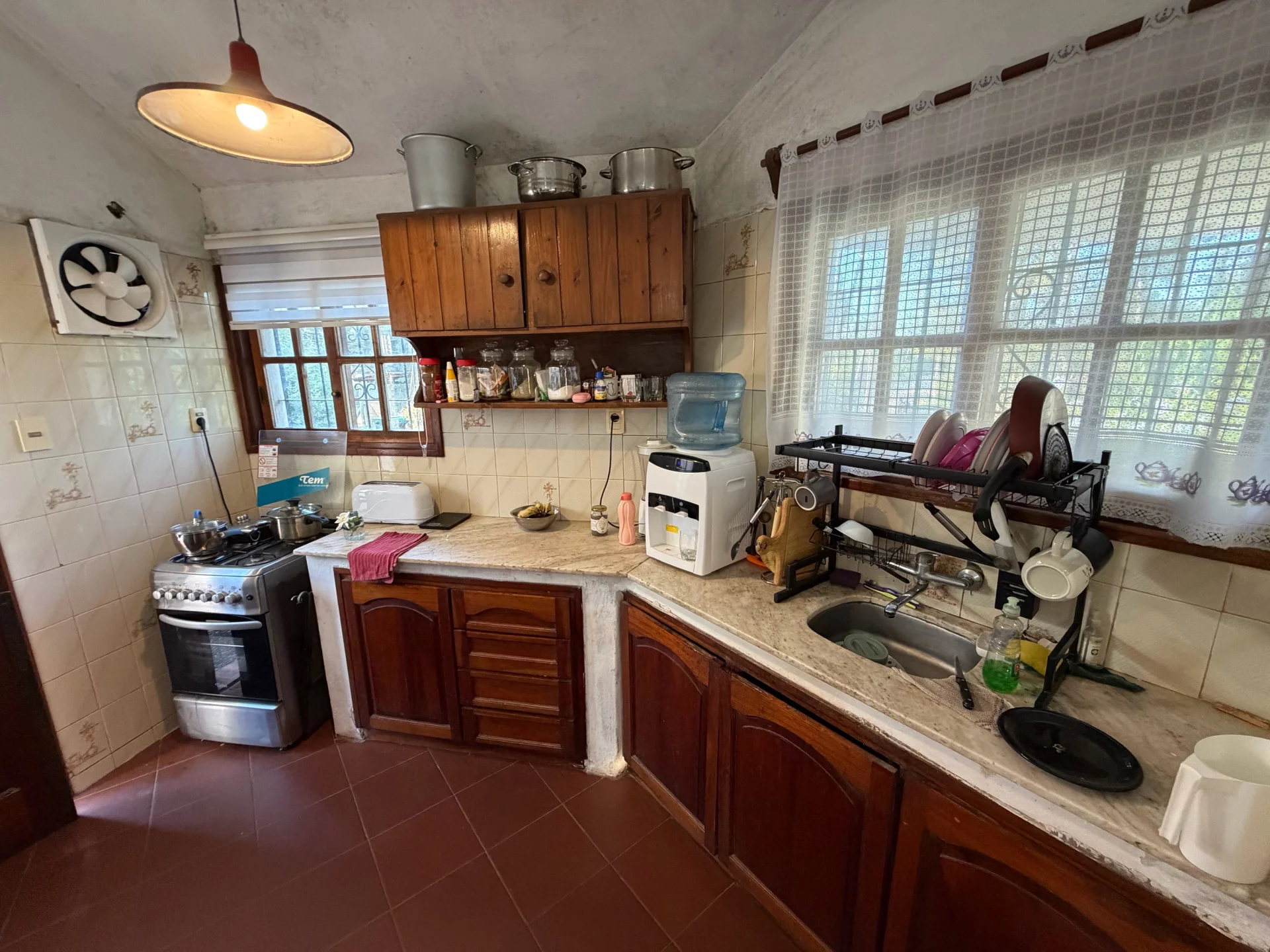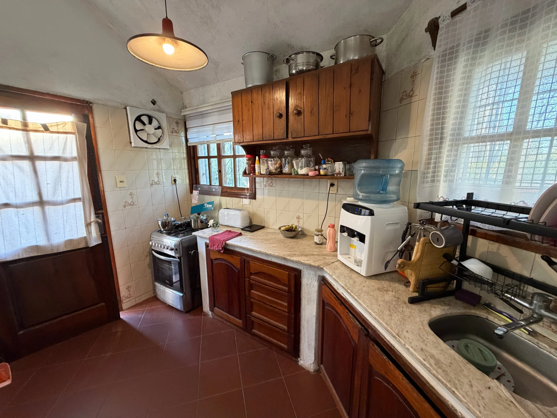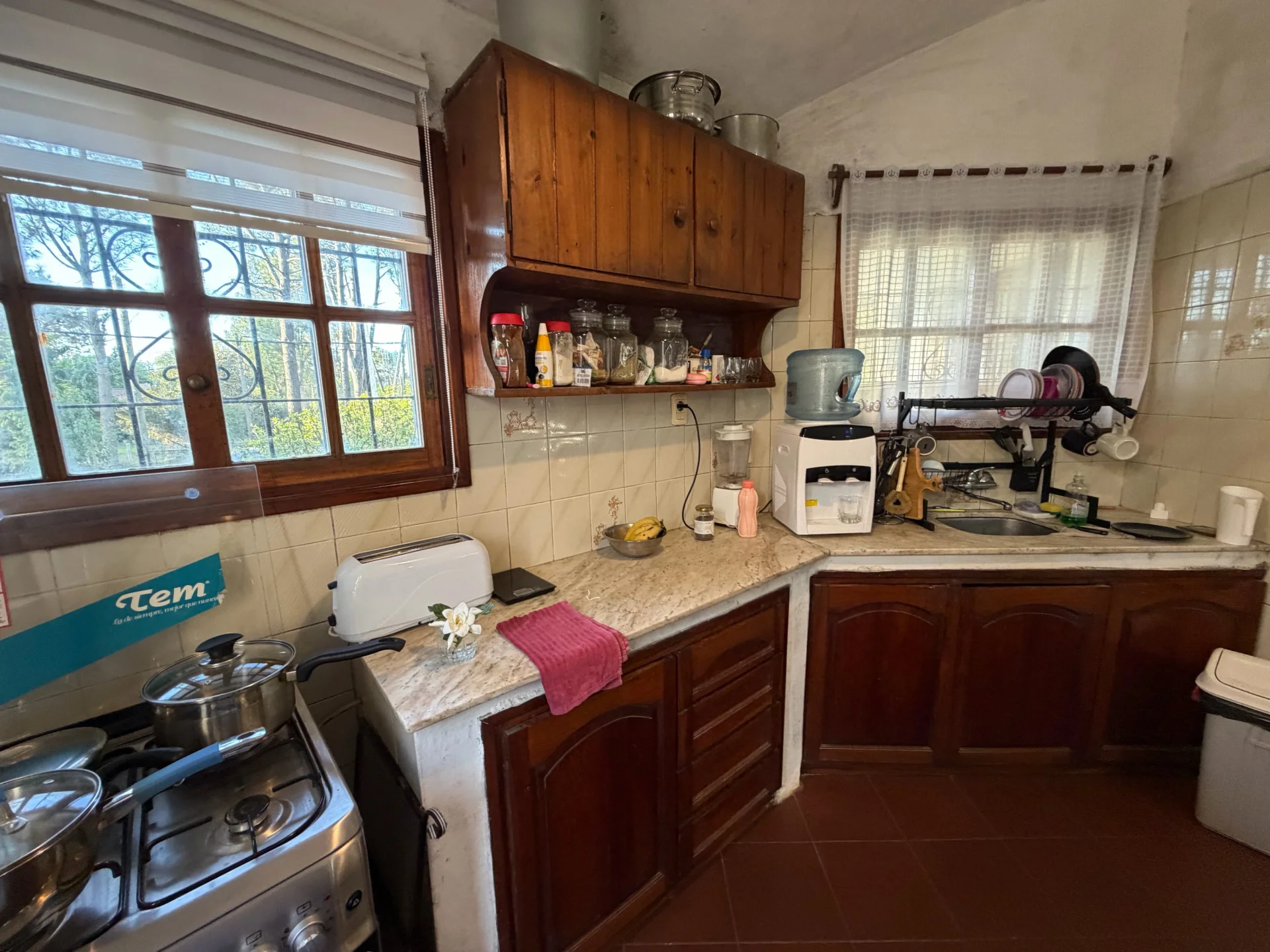 Todas las aberturas son en madera y cuentan con rejas, brindando seguridad y un estilo tradicional que acompaña la construcción.