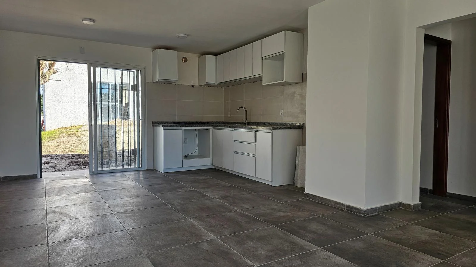 Amplio living comedor con cocina integrada, equipada con anafe y campana, Salida directa al fondo desde el área social.