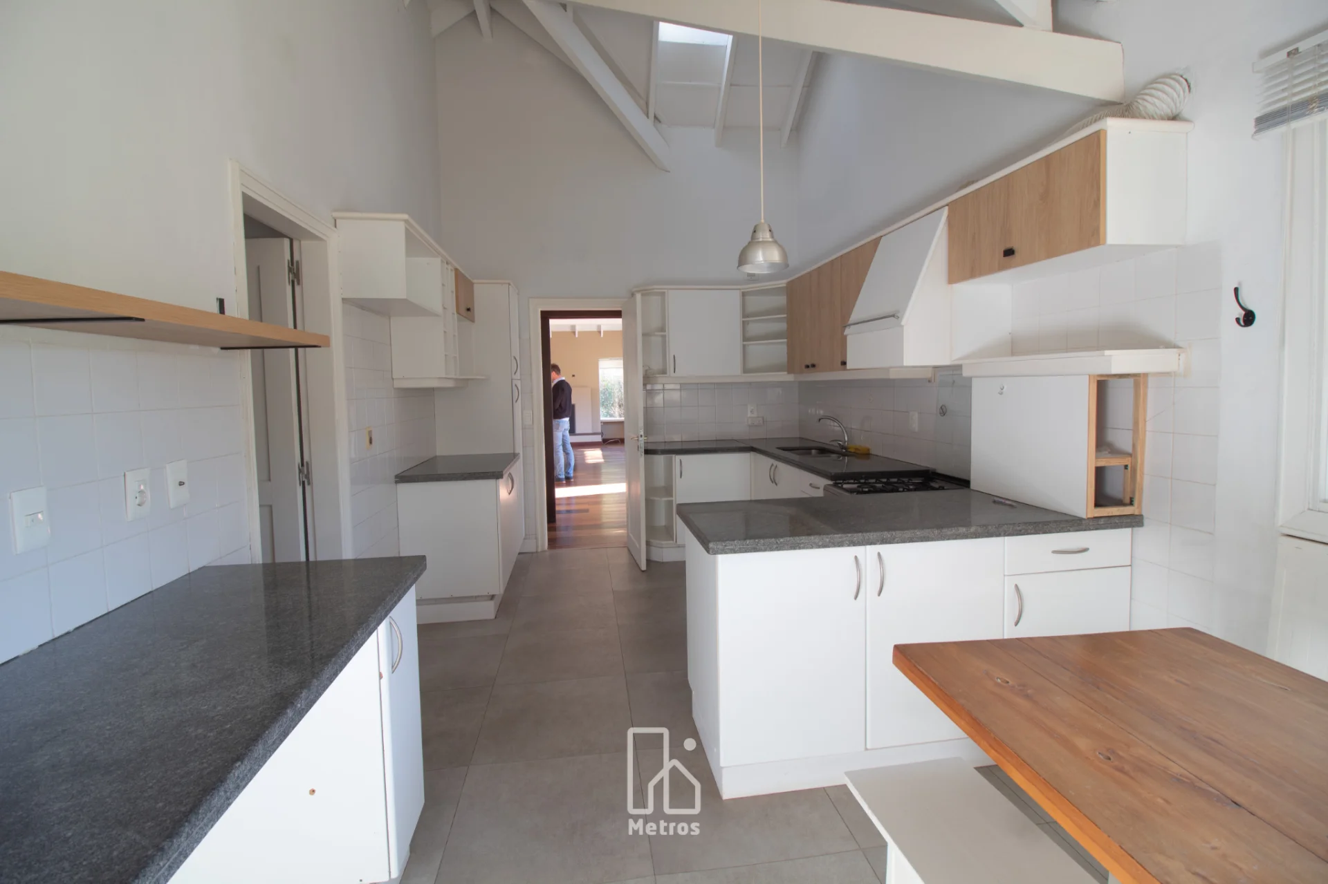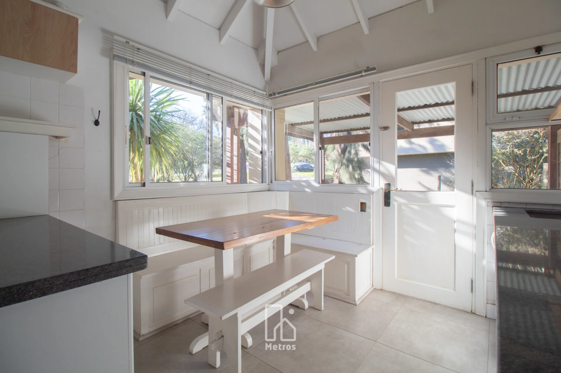 3 dormitorios + servicio • Dormitorio principal con vestidor y baño en suite • 3 baños completos • Living amplio con estufa de alto rendimiento • Estar independiente con estufa a piedra tradicional • Cocina amplia con comedor diario • Escritorio • Jardín al frente soleado • Deck con parrillero • Jardín trasero grande y privado • Depósito • Cochera
