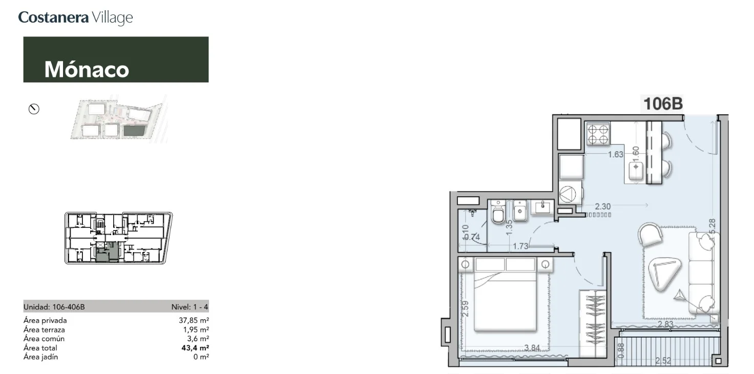 Apartamento de 1 dormitorio ubicado en la Torre Mónaco, en el primer piso.