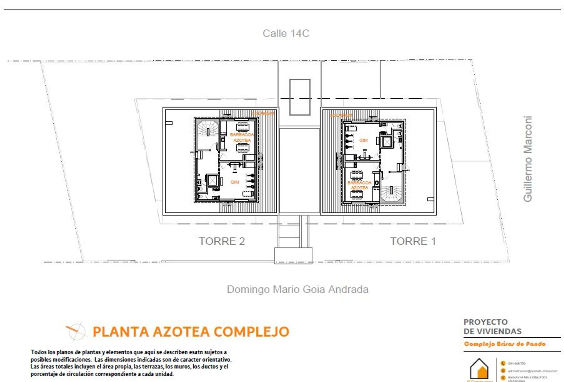 Corredor Responsable: - Contacto: Diego Alonso Este proyecto ubicado sobre la calle Marconi, a tan solo una cuadra de la avenida principal de ingreso a Pando y a tres del By pass de Ruta 101, nos ofrece una excelente ubicación, en un barrio tranquilo “como los de antes”. Se construirán dos torres de apartamentos con Amenities en planta baja entre medio de ambas torres y en el roof top de cada una de ellas. Es un proyecto innovador para la ciudad, que viene a brindar una opción hasta ahora desconocida para los habitantes, pero muy requerida en la zona. Ubicado en un punto tranquilo de la ciudad con fácil acceso y egreso tanto hacía Montevideo, como hacía el este. El complejo Brisas de Pando comienza sus obras en el año 2026, tiene fecha prevista de entrega en diciembre de 2027, son dos torres de edificios, en total 28 apartamentos de uno y dos dormitorios, ascensor en cada torre, cocheras, piscina, parrillero en planta baja, gimnasio y barbacoas con solarium en azoteas. Predio cerrado con circuito de videovigilancia. Finas terminaciones, construcción tradicional, ley de vivienda promovida que exonera del ITP en la compra, IVA y Patrimonio de corresponder y también exonera al inversor de pagar IRPF sobre el alquiler durante 10 años, todo esto lo hace un producto muy atractivo para invertir en pozo y adquirir estas unidades a un precio super promocional, rentabilidad del 20% sobre la inversión, es un producto único. El apartamento ofrecido en este aviso es el 103, ubicado en el primer piso de la torre A. La unidad tiene una superficie de 57 m², con una distribución funcional. Cuenta con dos dormitorios, cocina, living, baño y todos los ambientes definidos, además de una terraza de 2 m². Ofrece una vista despejada, excelentes terminaciones, y aberturas con doble vidrio que aseguran aislamiento térmico y acústico. Es una excelente oportunidad para adquirir un apartamento moderno con los mejores amenities que hay en la zona. Además, existe la posibilidad de adquirir una cochera por USD 3.000. Los gastos comunes se estiman en $ 4.500 aproximadamente. Los gastos de ocupación ascienden al 3%. Precio promocional contado U$S 102.900.- Precio promocional entregando el 20% y luego por avance de obra durante el año y medio de la misma U$S 113.000.- Consulte por otras unidades. Compartimos con todos los colegas Comisión inmobiliaria 3% más IVA Cada Oficina es de propiedad, gestión y desarrollo independiente La presente publicación describe las características esenciales del inmueble, debiéndose consultar al responsable de la operación por la eventual actualización de las medidas, descripciones arquitectónicas y funcionales, servicios, impuestos, precios y demás información, cuyos valores son aproximados.