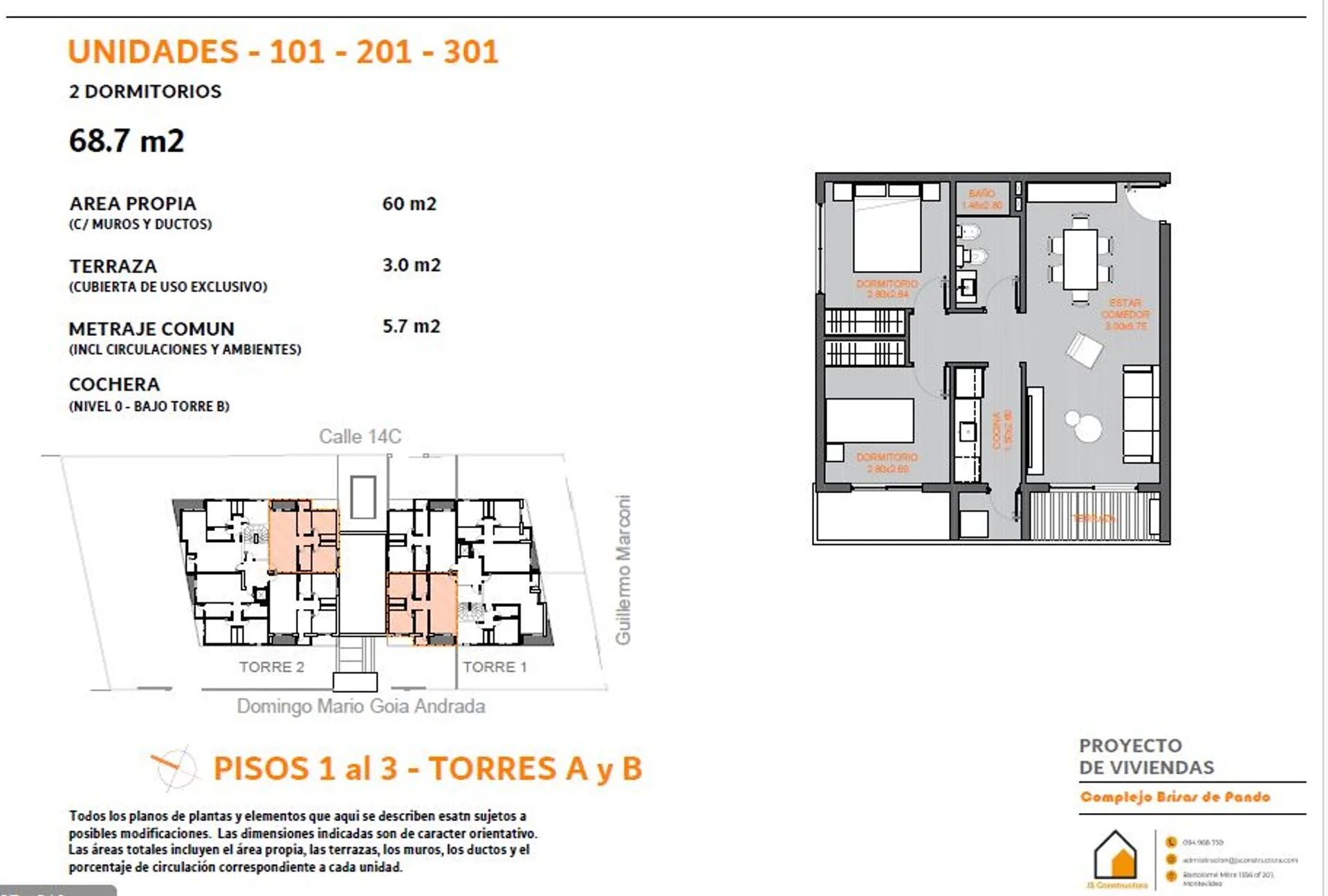 Corredor Responsable: - Contacto: Valeria Ruiz Se vende en exclusividad, apartamento en pozo, complejo Brisas de Pando. Ubicado en punto estratégico de la ciudad con fácil acceso y egreso tanto a Montevideo como hacia el este. El complejo Brisas de Pando comienza su obra el próximo año 2026, tiene fecha prevista de entrega en Diciembre 2027. Son dos torres de edificios con un total de 28 apartamentos de uno y dos dormitorio, ascensor en cada torre, cocheras, piscina, parrillero en planta baja, gimnasio y barbacoas con solárium en azoteas. Predio cerrado con circuito de videovigilancia. Con finas terminaciones, construcción tradicional, ley de vivienda promovida que exonera del ITP en la compra, IVA y patrimonio de corresponder y también exonera al inversor de pagar IRPF sobre el alquiler dentro de 10 años. Todo esto lo hace un producto muy atractivo para invertir en pozo y adquirir estas unidades a un precio super promocional con rentabilidad del 20% sobre la inversión, es un producto único. El apartamento disponible es el 201, ubicado en el segundo piso de la torre B. La unidad tiene una superficie de 60 m², con una distribución funcional. Cuenta con dos dormitorios, cocina-comedor, living y baño. Todos los ambientes bien definidos, además, cuenta con una terraza de 3 m². Comparte piso con otros tres apartamentos, ofrece vista despejada con excelentes terminaciones. Es una excelente oportunidad para adquirir un apartamento moderno con los mejores amenities que hay en la zona. Los gastos comunes se estiman en $ 4.500.- aproximadamente mensuales. Gastos de ocupación 3% sobre el valor de la unidad. Cuenta con la posibilidad de adquirir una cochera con un costo adicional de USD 3.000.- Precio promocional contado USD 105.900.- Precio promocional dando el 20% de entrega inicial y luego por avance de obra hasta culminar con la misma USD 116.000.- Consulte por otras unidades. Compartimos con todos los colegas. Comisión inmobiliaria 3% Mas IVA Cada Oficina es de propiedad, gestión y desarrollo independiente La presente publicación describe las características esenciales del inmueble, debiéndose consultar al responsable de la operación por la eventual actualización de las medidas, descripciones arquitectónicas y funcionales, servicios, impuestos, precios y demás información, cuyos valores son aproximados.