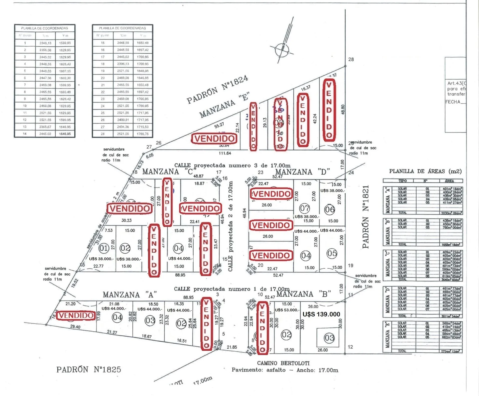 Corredor Responsable: - Contacto: Viviana Fernández Pérez Se venden terrenos desde U$S 38.000 en adelante, el precio depende del tamaño y ubicación. Las dimensiones arrancan de 405m² en adelante. Son terrenos nivelados, ute y ose en la puerta, a pocas cuadras del centro de Pando. Locomoción desde y hacía Montevideo por Camino Bertolotti cada una hora. Se vienen vendiendo muy bien, va a quedar un barrio super lindo, con buenas construcciones, no se pierdan la oportunidad de pertenecer a este nuevo barrio en Pando. Financiación directa con el propietario entregando el 50% y el saldo hasta en 60 cuotas. Comisión inmobiliaria 3% más IVA Compartimos con todos los colegas Cada Oficina es de propiedad, gestión y desarrollo independiente La presente publicación describe las características esenciales del inmueble, debiéndose consultar al responsable de la operación por la eventual actualización de las medidas, descripciones arquitectónicas y funcionales, servicios, impuestos, precios y demás información, cuyos valores son aproximados.