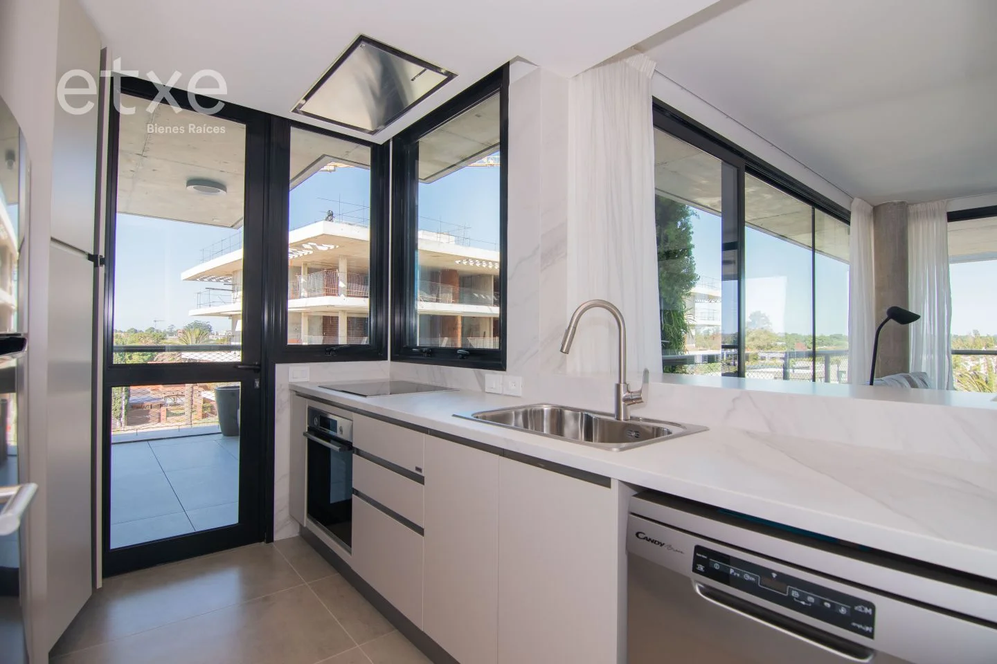 El apartamento se vende sin muebles. Se ingresa a pasillo con toilette. Living comedor con estufa a leña. Amplia terraza con parrillero y espectacular vista al lago. Cocina semi-integrada equipada con anafe, horno empotrado, campana, pileta Johnson y conexión para lavaropa, secaropa y lavavajillas. Además cuenta con acceso a terraza secundaria. Dormitorio principal en suite, vestidor y salida a terrazas a cada lado. Dos dormitorios secundarios con vista al parque. Baño completo.
