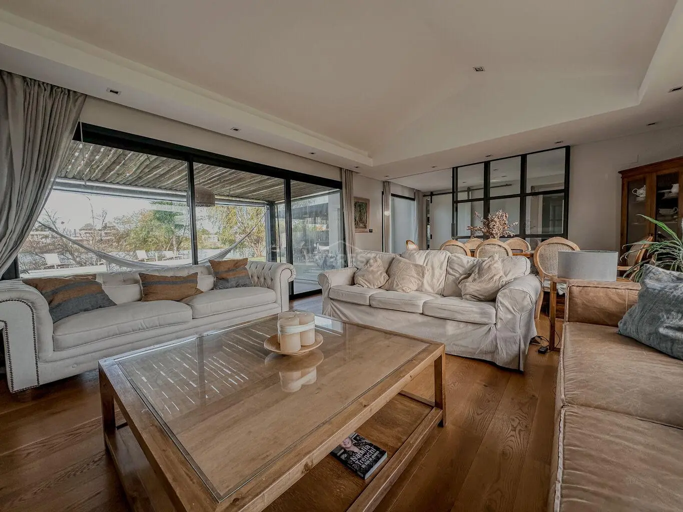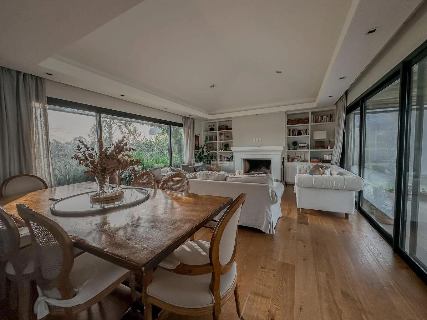 -Living comedor con estufa a leña y salida a deck exterior techado