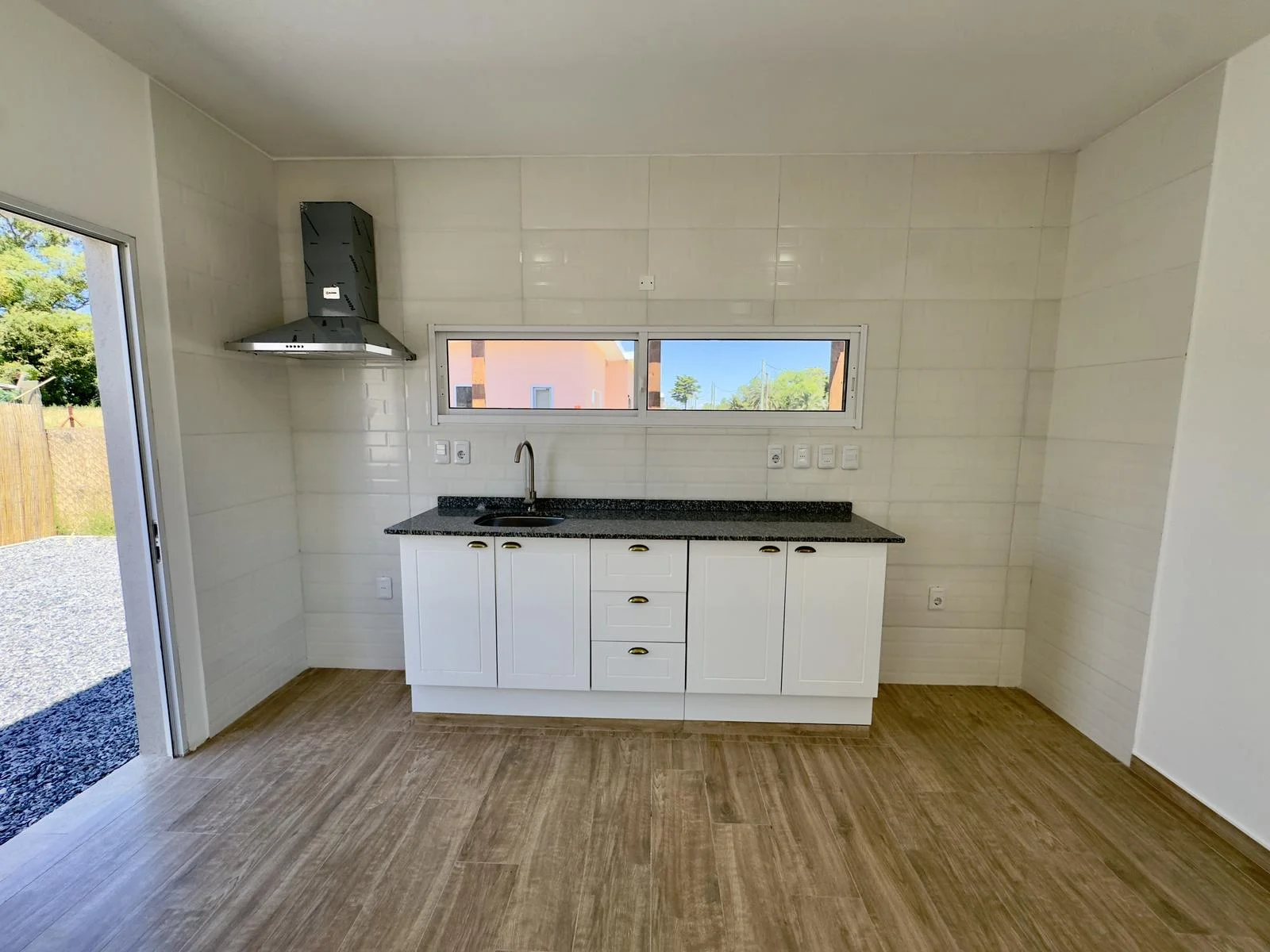 • Cocina integrada, equipada con mueble bajo mesada a medida y campana extractora.