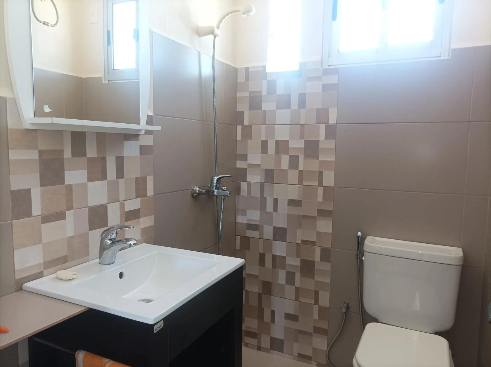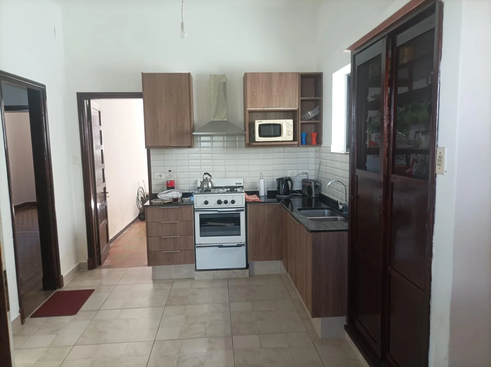 Cocina comedor actualizado, con estufa a leña, baño y dos dormitorios en planta baja.