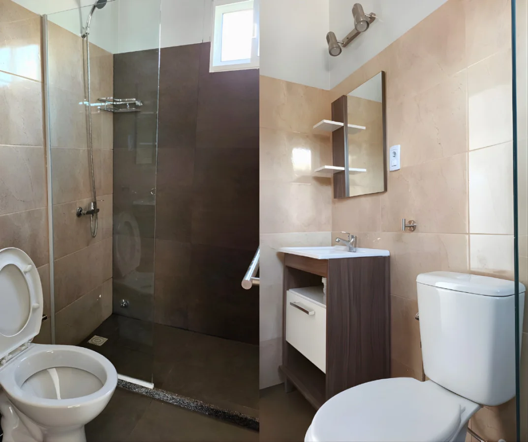 Baño completo, a nuevo, con mampara de vidrio y mueble.