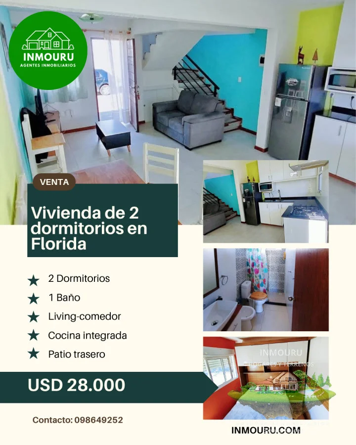 La propiedad se encuentra en área tranquila de Florida, se trata de una vivienda tipo dúplex, con living-comedor y cocina integrada en la planta inferior, mientras en la planta superior se encuentra 2 dormitorios y un baño. También cuenta con patio posterior y espacio para estacionar un vehículo.