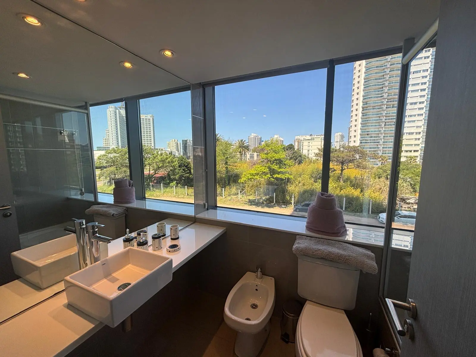 Posee un Hall de acceso en doble altura con zonas lounge, importantes amenities ubicados en planta Baja, que se relacionan espacialmente, uniendo en un todo la piscina exterior, la interior climatizada (ambas de agua salada),el solarium, el gimnasio, el sauna y la sala de masajes,