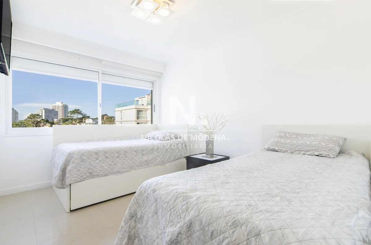 Este atractivo apartamento en Punta del Este se encuentra estratégicamente ubicado a 500 metros del mar, brindando a sus residentes la conveniencia de la cercanía a la playa. La propiedad cuenta con 2 dormitorios, 2 baños y 2 suites, ofreciendo capacidad para hasta 4 personas con un total de 3 camas y con una superficie total de 89 m2, este apartamento ofrece un espacio cómodo y bien distribuido.