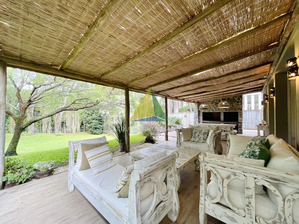 En un lote de 1.056 m2 y desarrollada en 280 m2 distribuidos en dos plantas, esta espléndida propiedad cuenta con un espacioso living comedor con hogar a leña, ventanales de piso a techo que permiten disfrutar el jardín desde el interior de la casa. Parque que rodea toda la casa, ofreciendo una vista despejada y verde desde cualquier rincón. Aquí se ubica el parrillero techado con living exterior y excepcional vista arbolada.