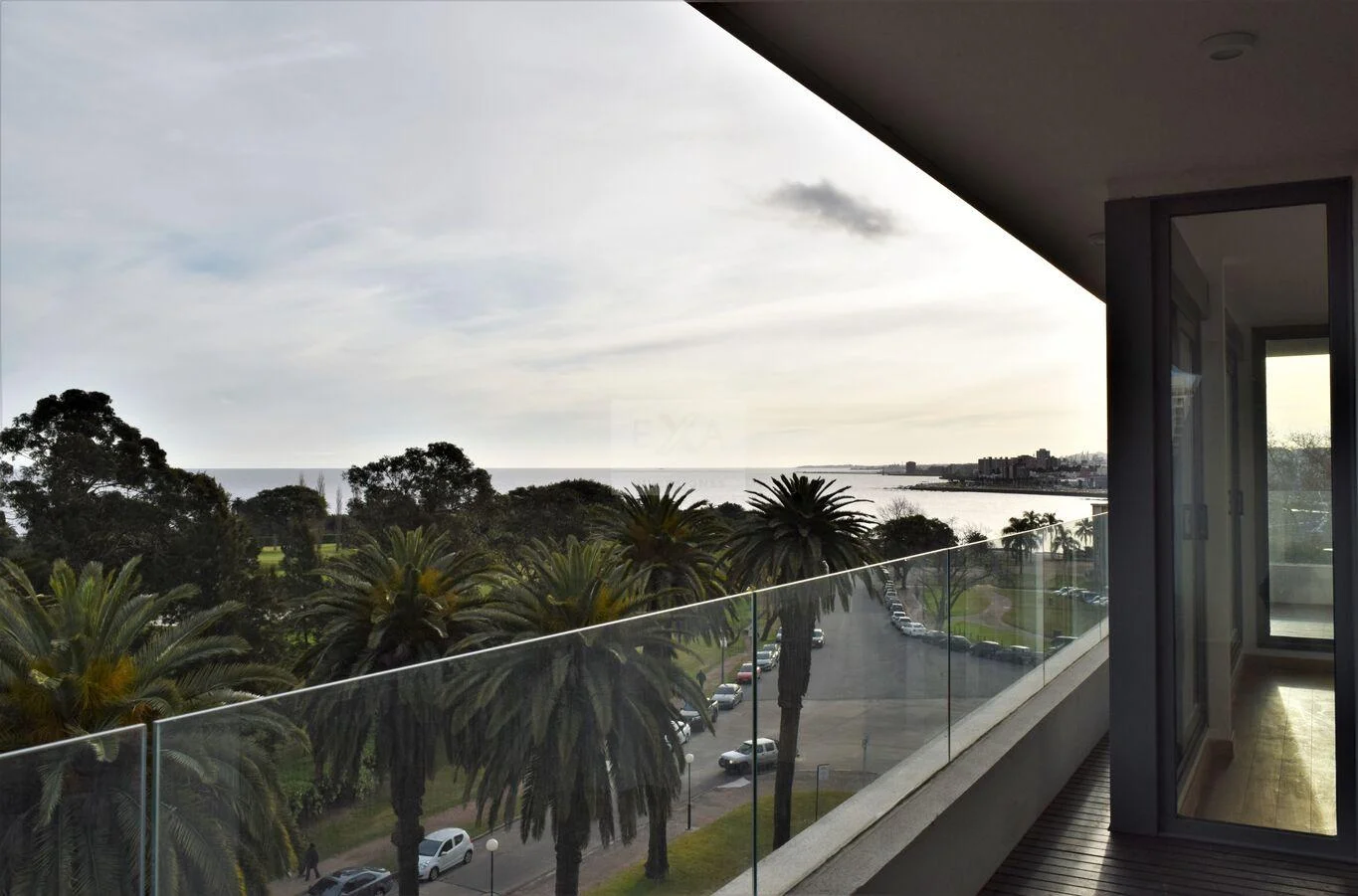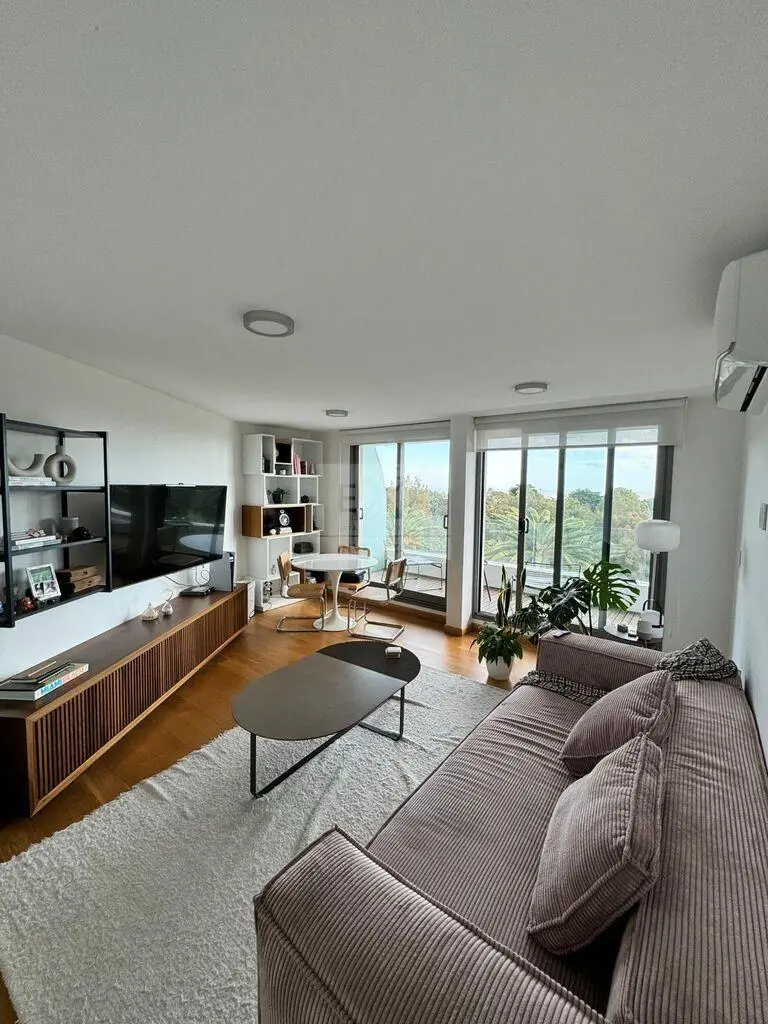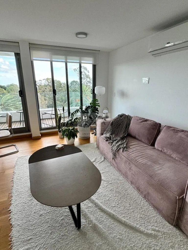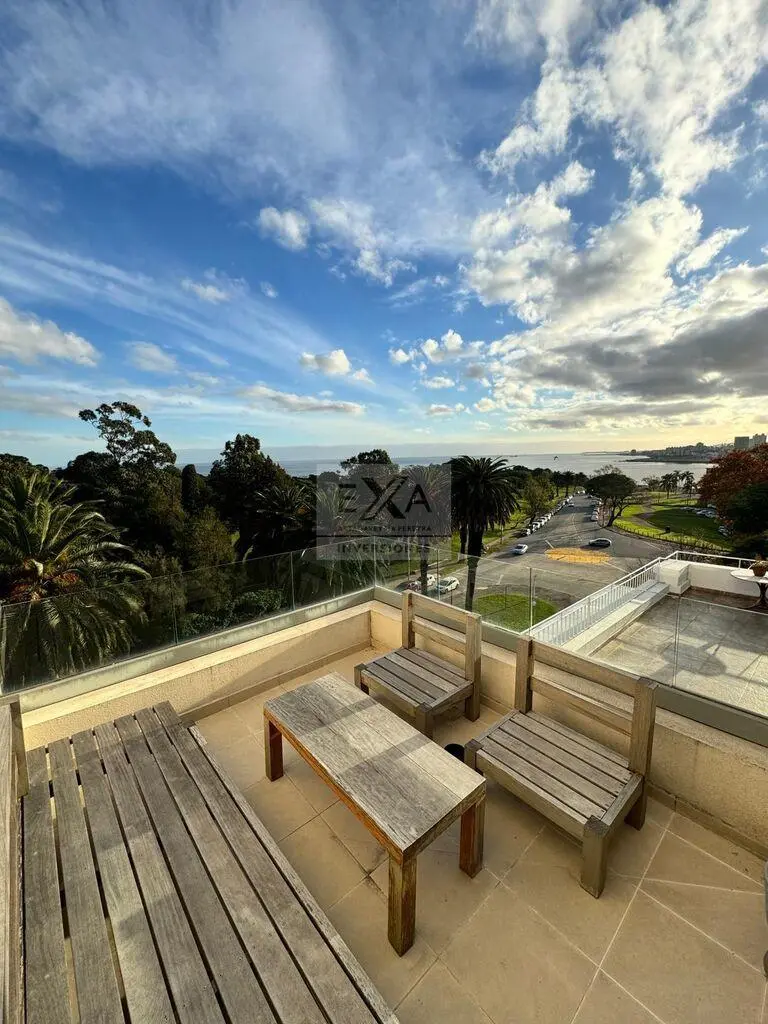 Living comedor con balcón al frente, 2 dormitorios (principal en suite), 2 baños completos, cocina definida con salida a gran terraza al frente, y terraza de servicio al contrafrente.