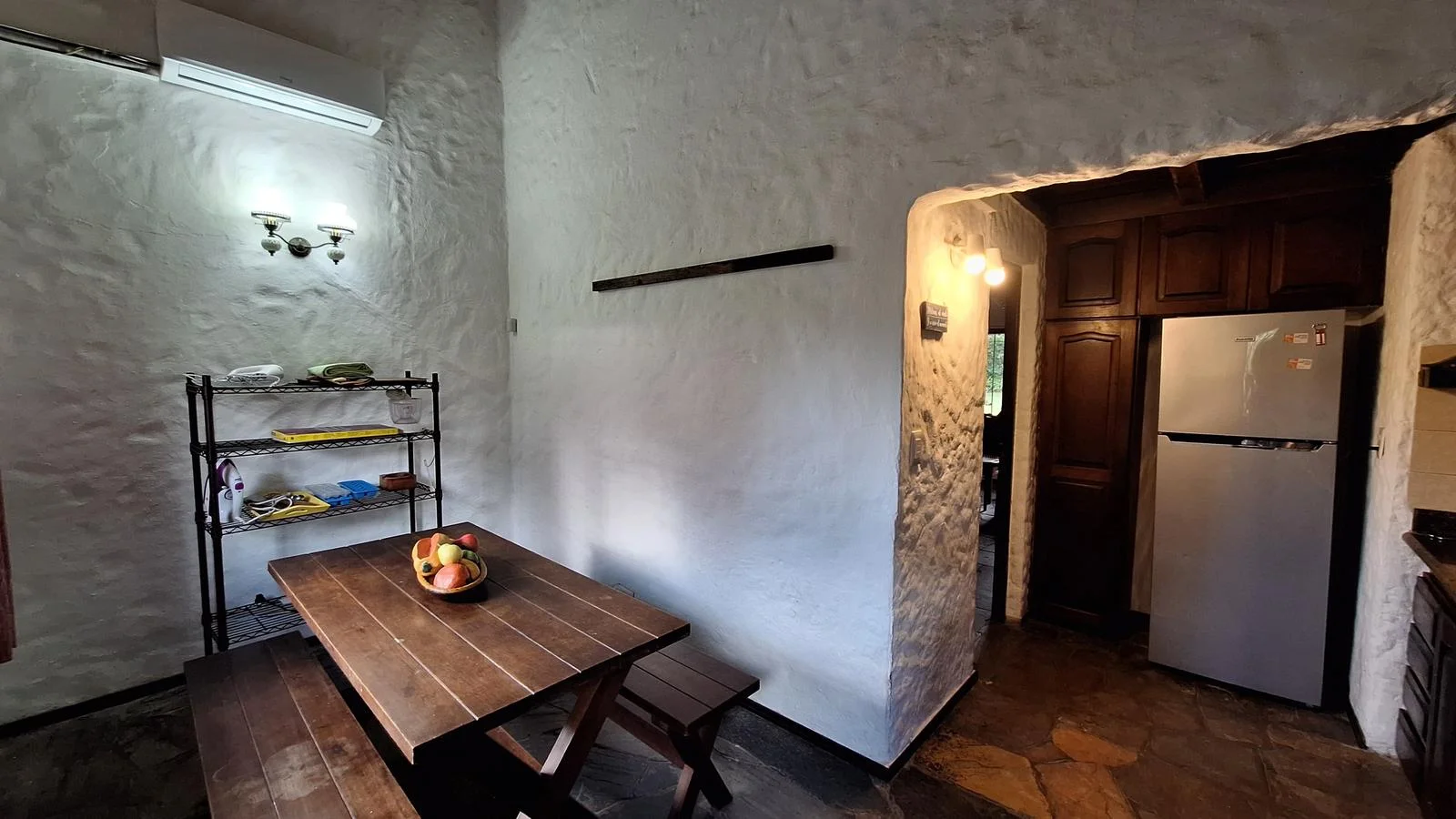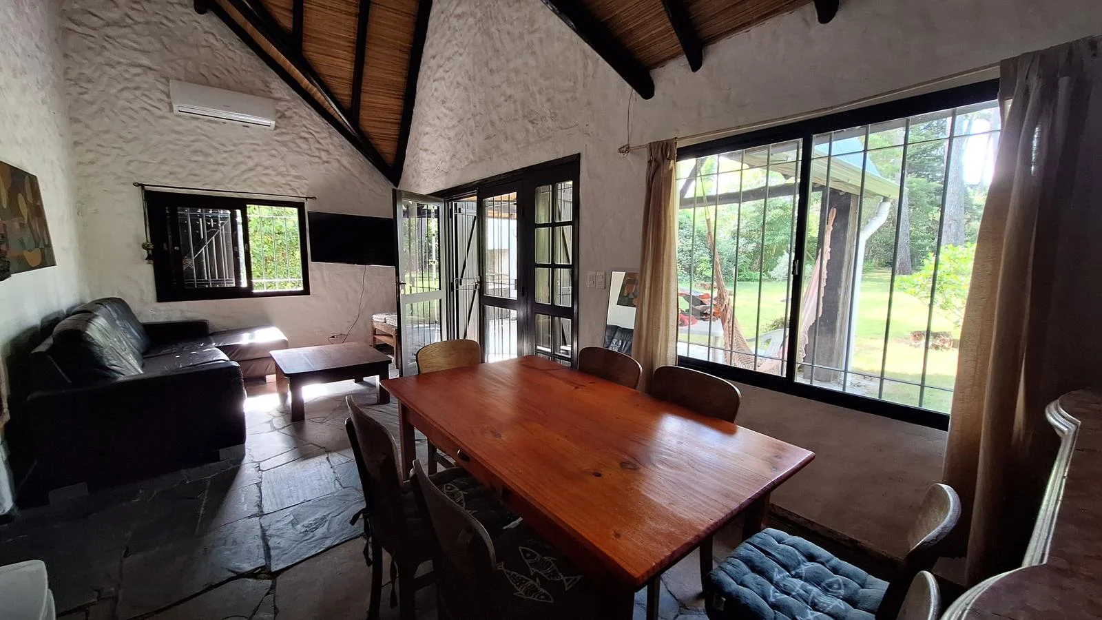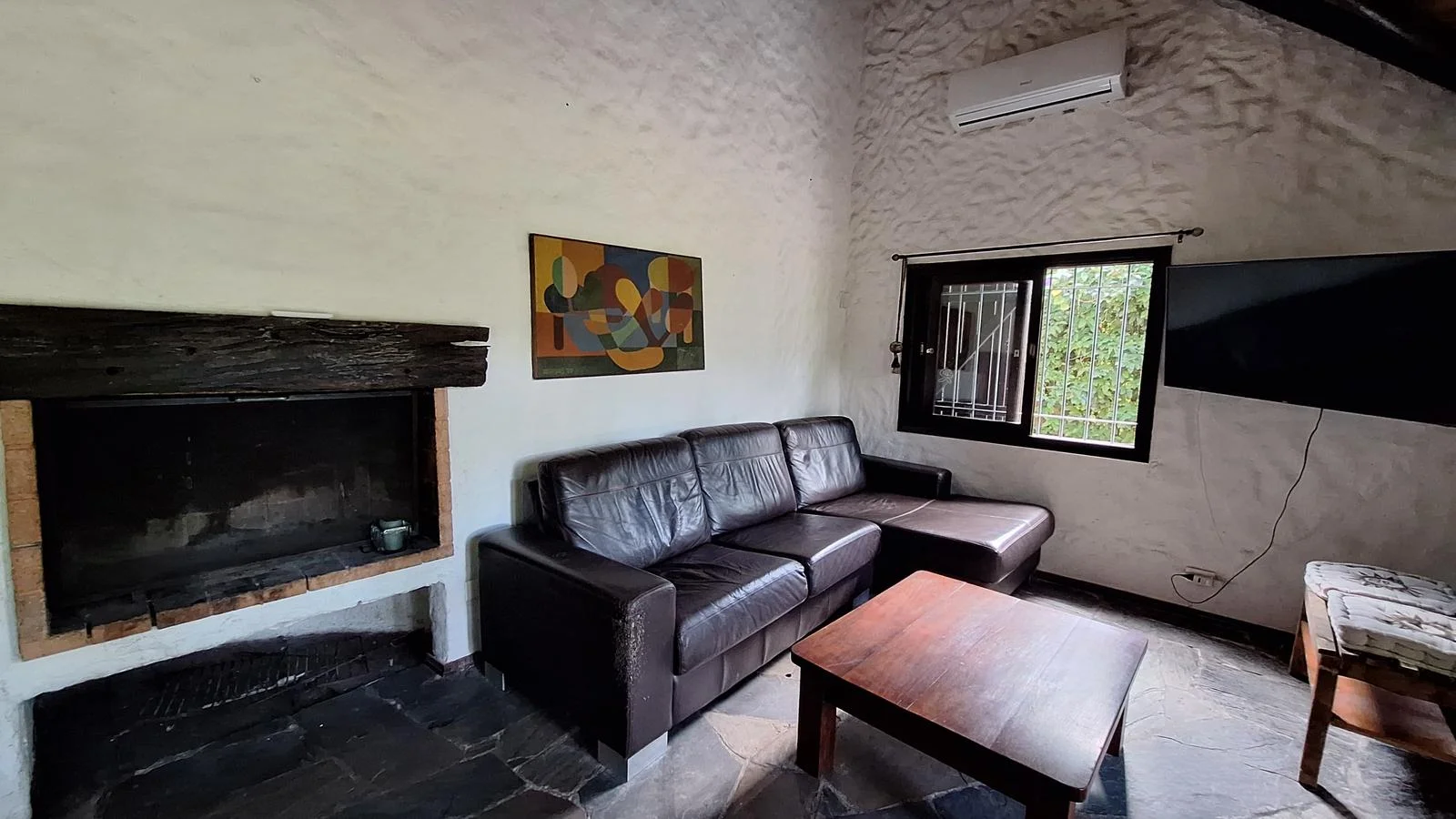 En el interior, la casa ofrece un cómodo living comedor con estufa a leña y aire acondicionado, creando un ambiente cálido en invierno y fresco en verano. La cocina definida es espaciosa, con desayunador, aire acondicionado y buena capacidad de guardado.