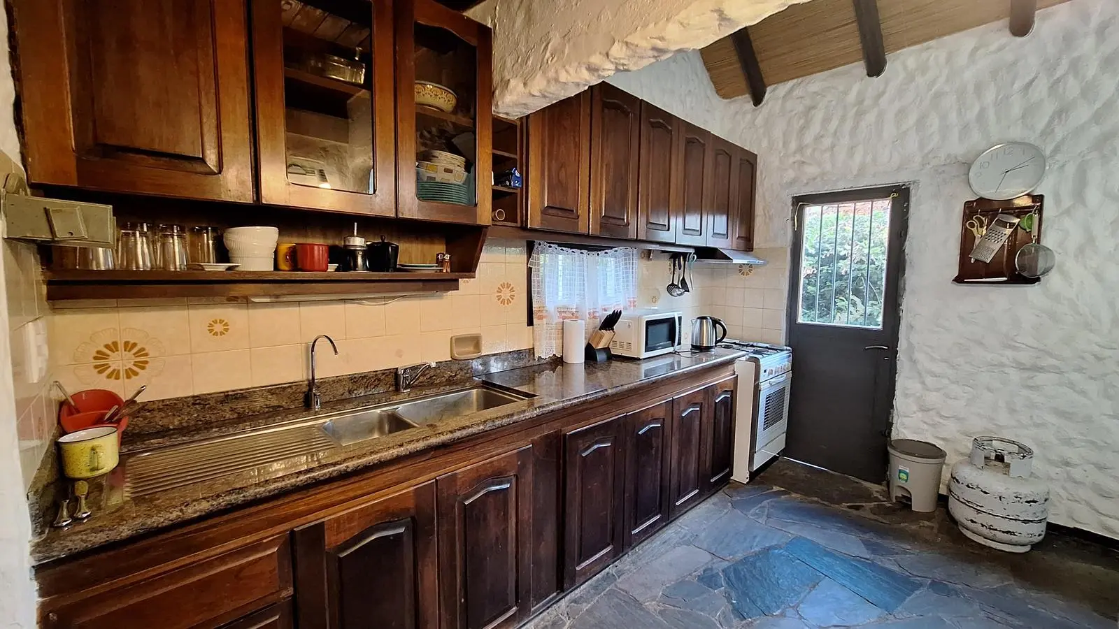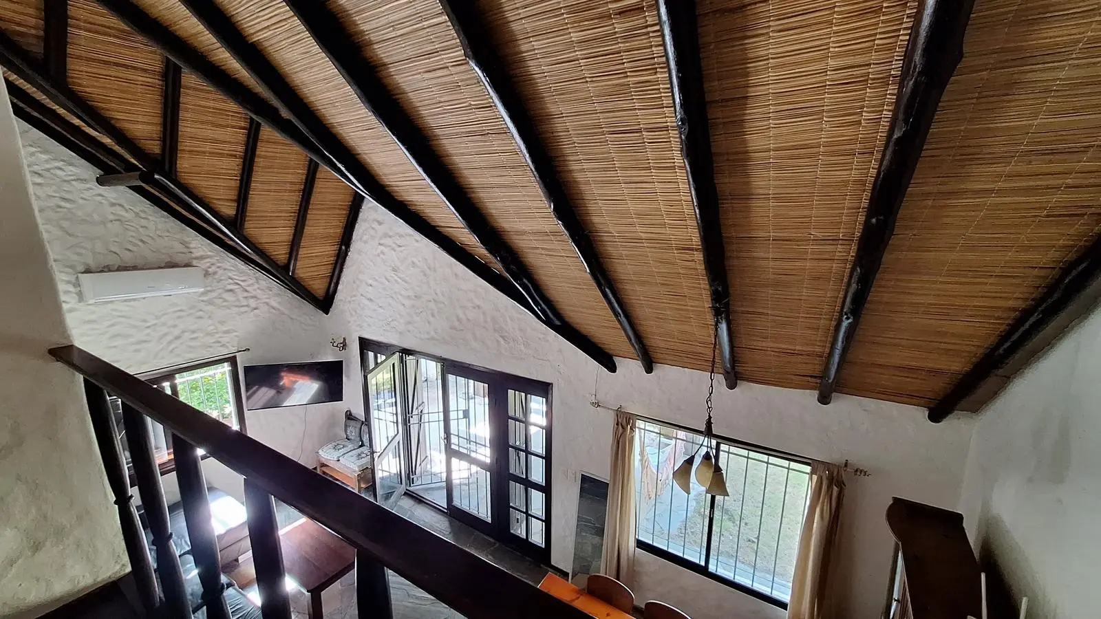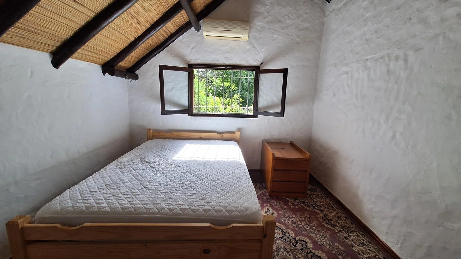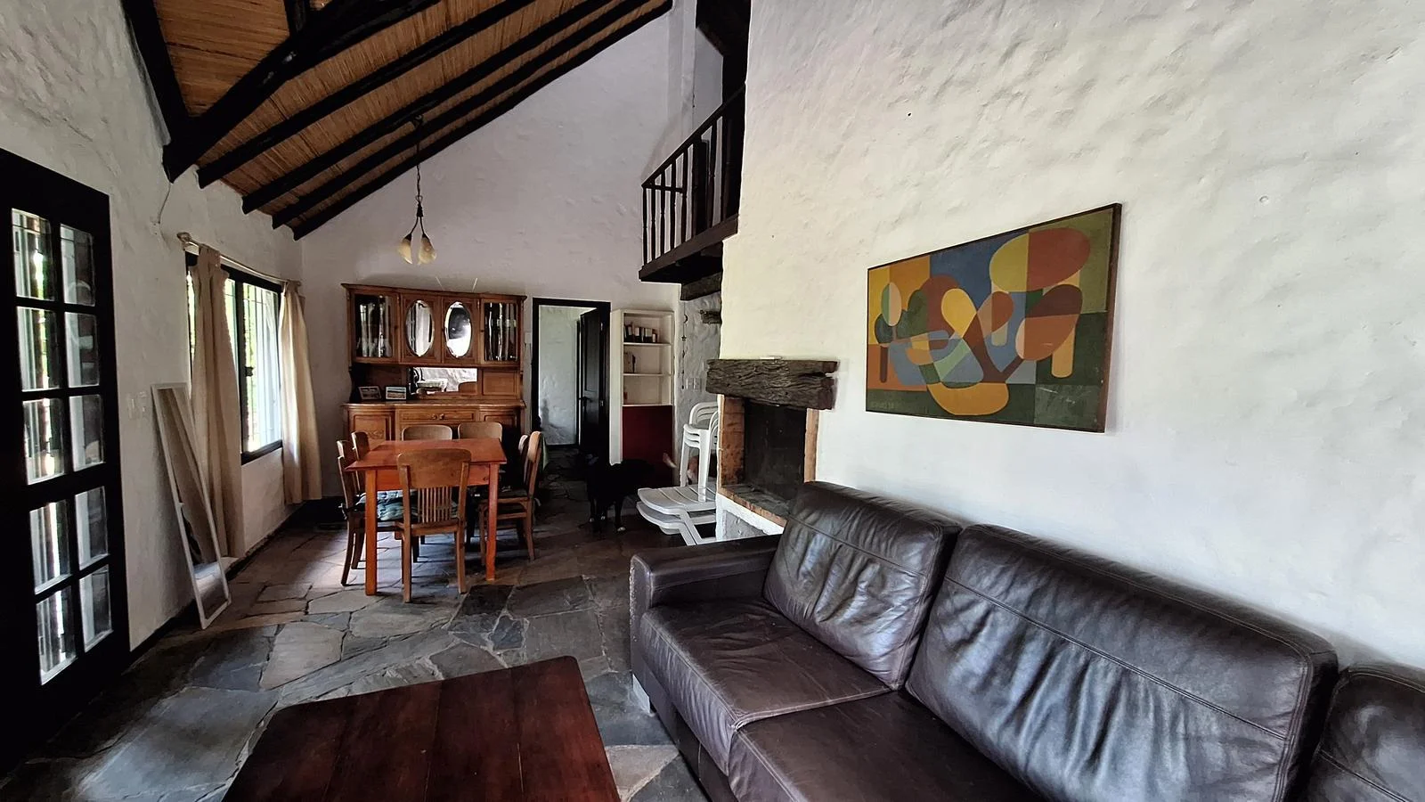 En el interior, la casa ofrece un cómodo living comedor con estufa a leña y aire acondicionado, creando un ambiente cálido en invierno y fresco en verano. La cocina definida es espaciosa, con desayunador, aire acondicionado y buena capacidad de guardado.