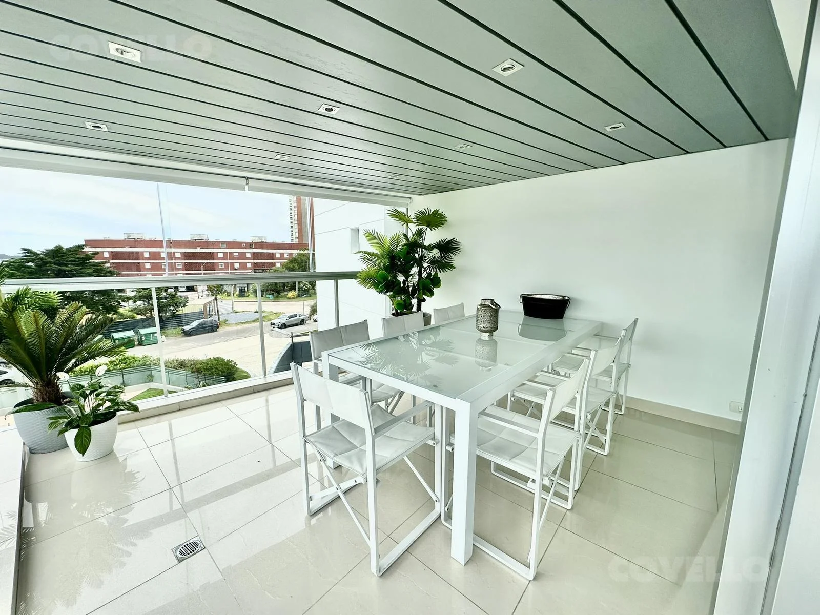 Terraza con parrillero, living comedor, 2 dormitorios, 2 baños, cocina y garage.