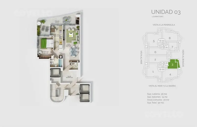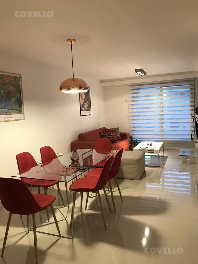 Departamento con exclusiva vista al bosque de 2 ambientes. Dormitorio principal en suite con baño completo. Amplio Living comedor con balcón terraza. Cocina con comedor diario con lavadero . Toilette.