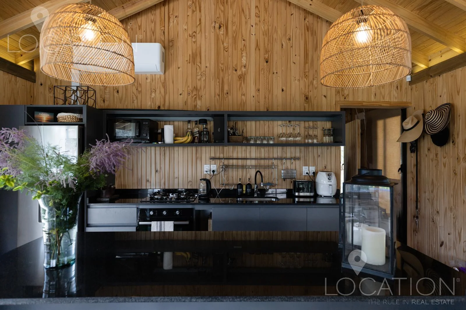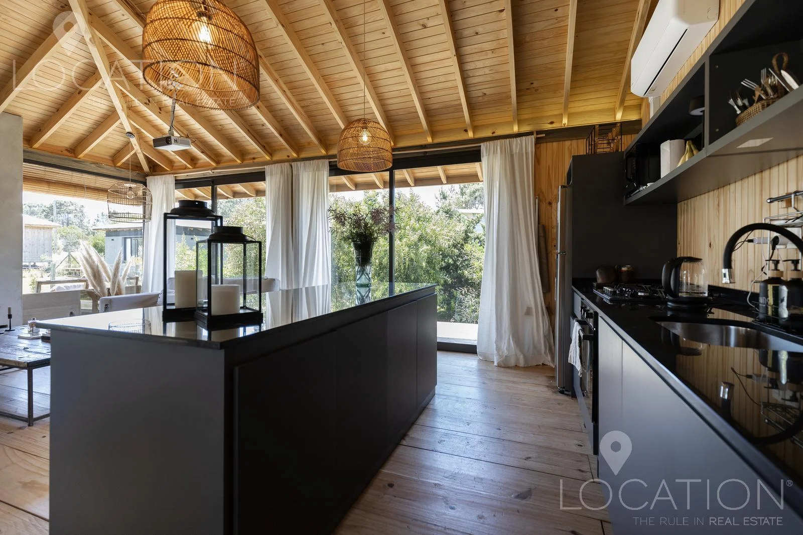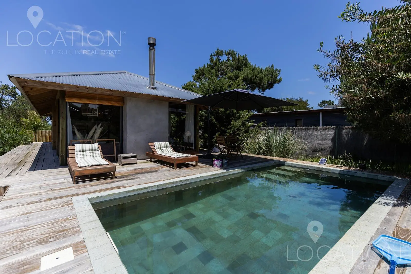 Casa de diseño en Arenas de Jose Ignacio de un dormitorio y un baño. Cocina Americana con living comedor integrado. Cuenta con piscina y parrilla portatil con soalrium y disposicion norte