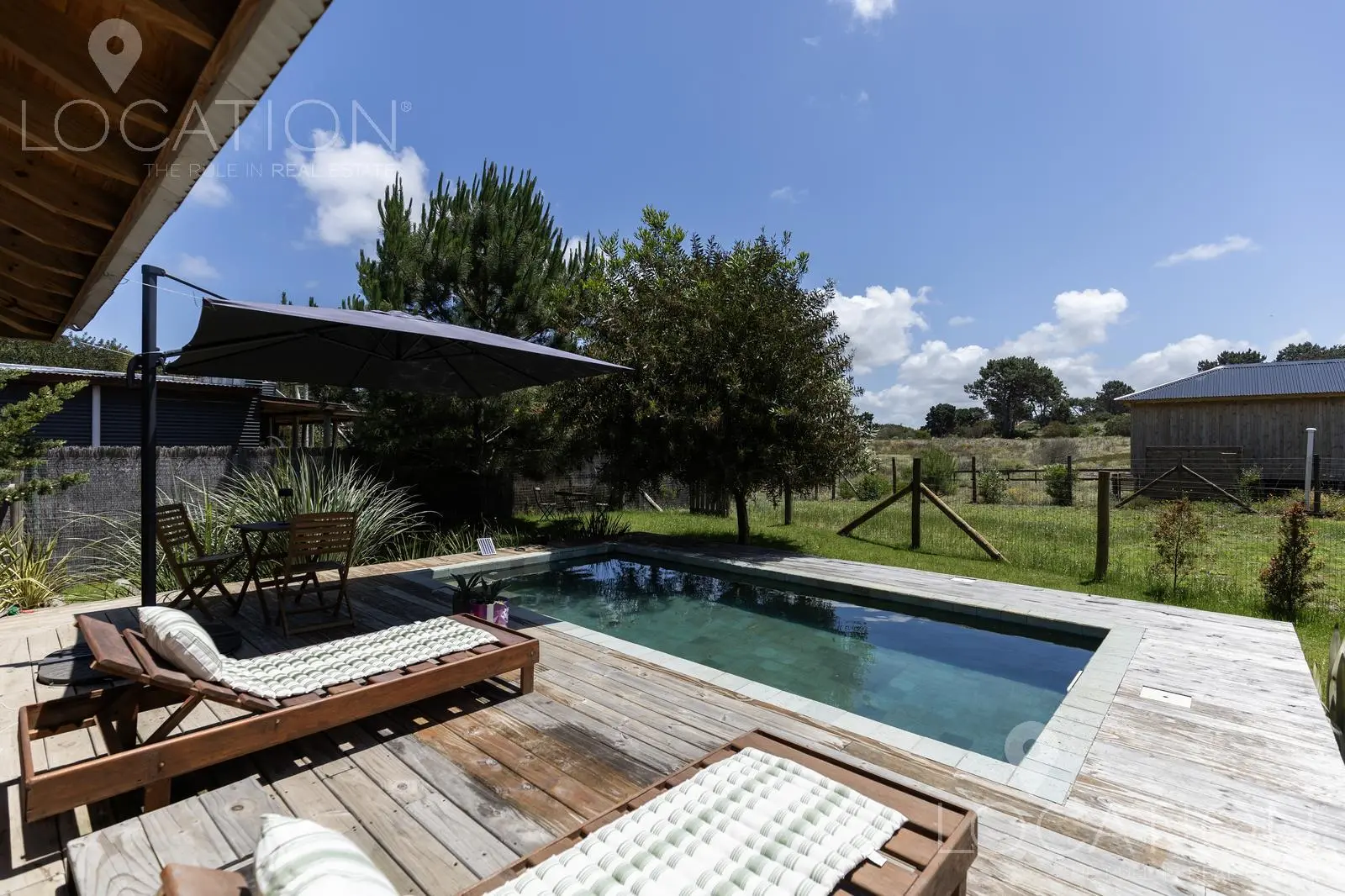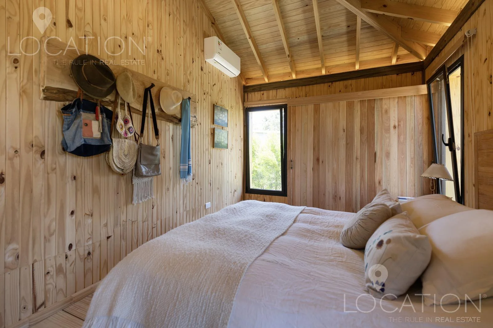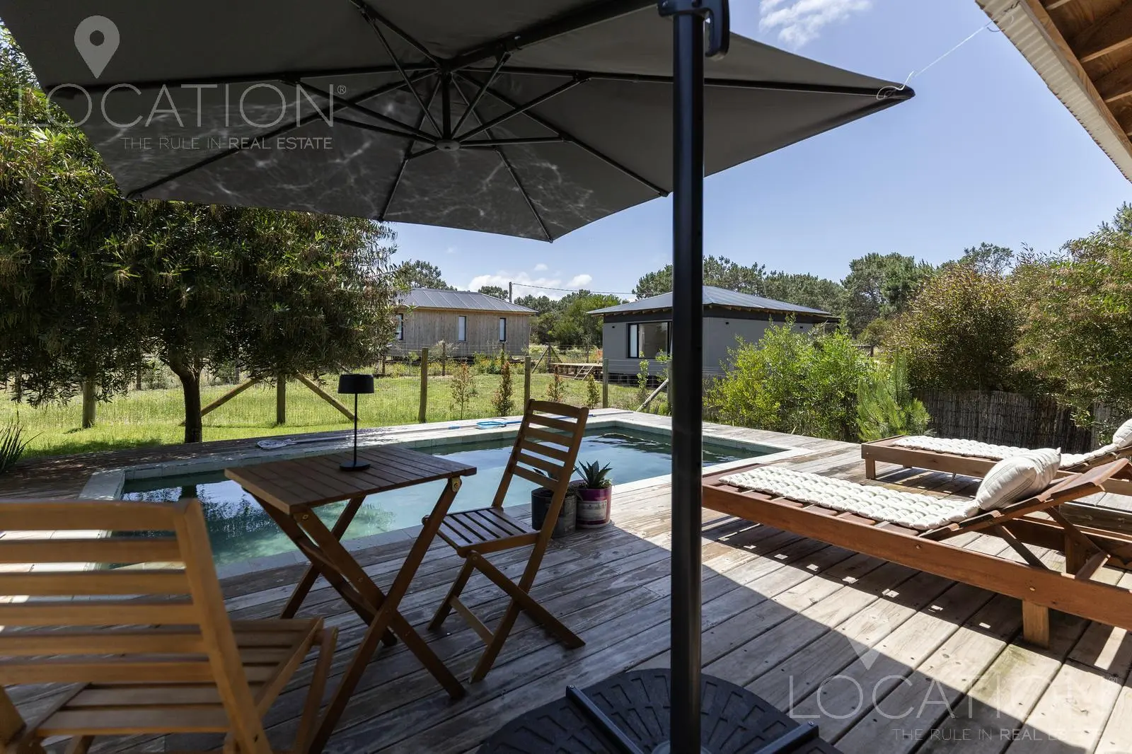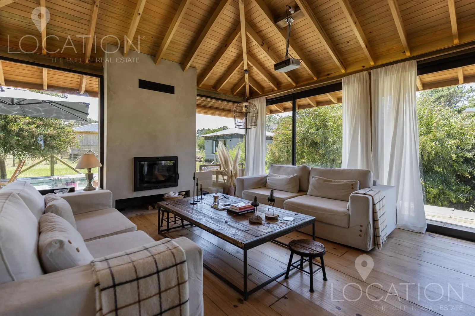 Casa de diseño en Arenas de Jose Ignacio de un dormitorio y un baño. Cocina Americana con living comedor integrado. Cuenta con piscina y parrilla portatil con soalrium y disposicion norte