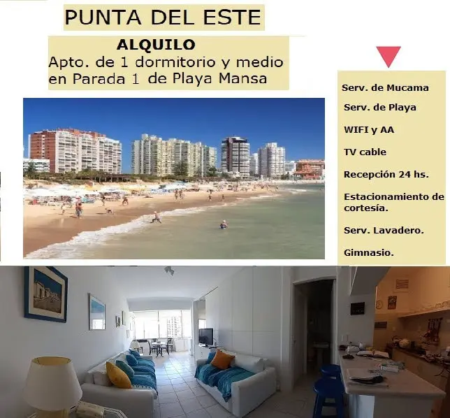 Apartamento de 1 dormitorio y medio frente a playa mansa en parada 1 con servicio de mucama, gimnasio, wifi, tv cable, AA, servicio playa, estacionamiento de cortesía vigilado, recepción 24 hs. 2da. Quincena enero u$s 2.300 Febrero semana de carnaval u$s 150 x día. 2da. quincena u$s 130 x día.