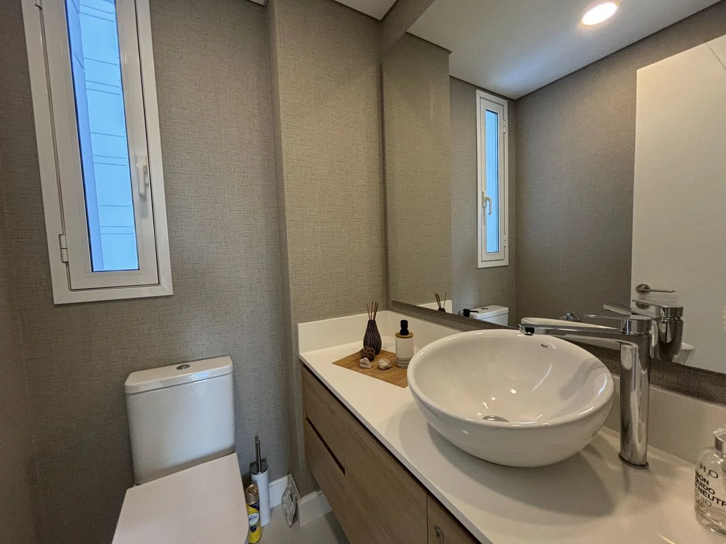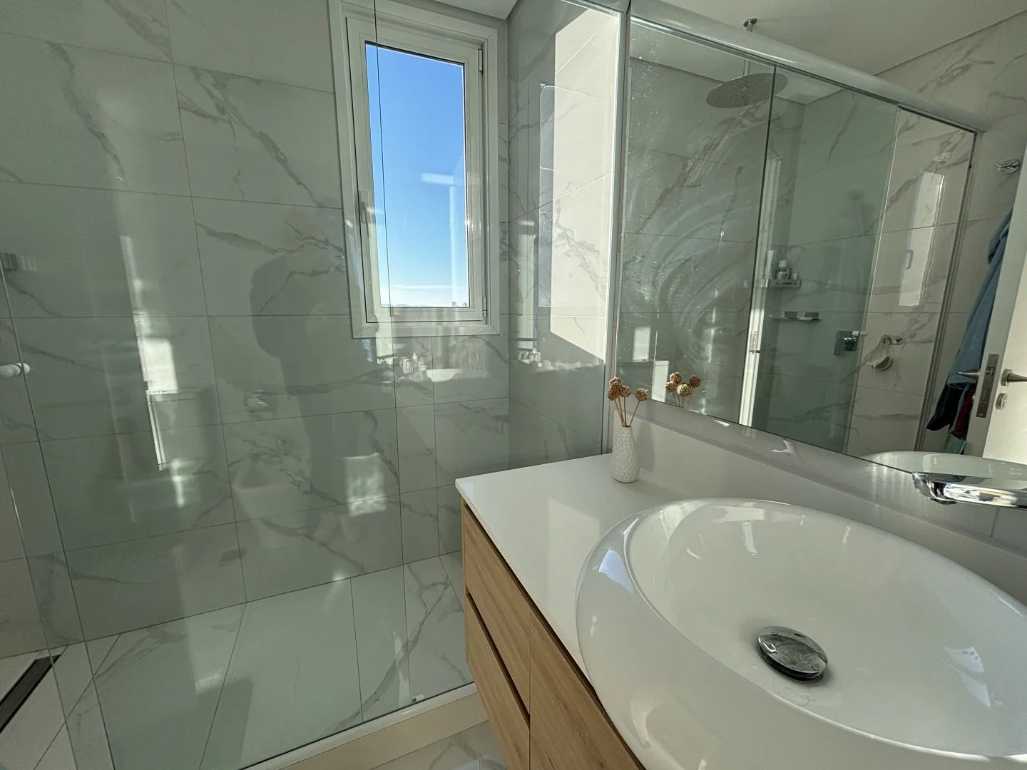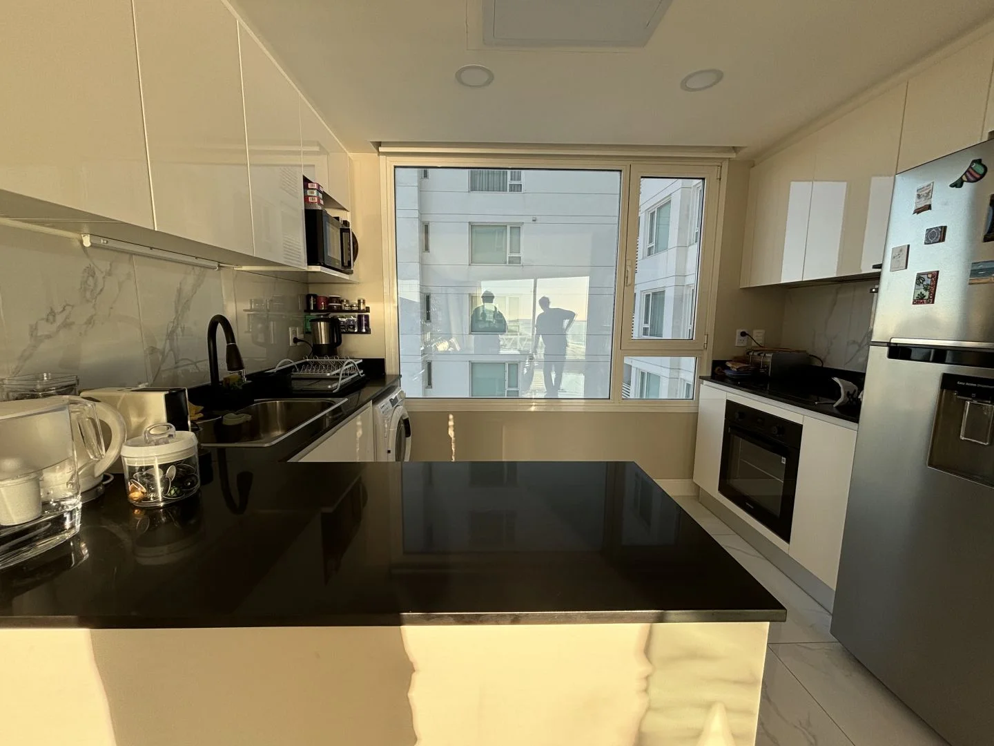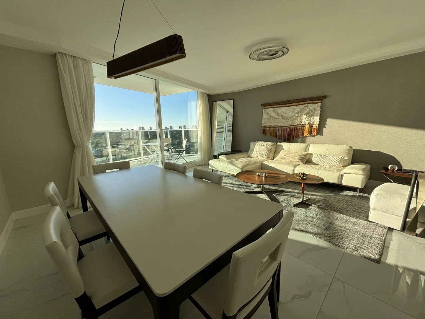 Equipada con todas las comodidades modernas: microondas, lavavajillas, heladera con freezer, tostadora, placard, campana y horno. El gran living comedor cuenta con muebles elegantes, mesa, televisión y, por supuesto, vistas espectaculares.