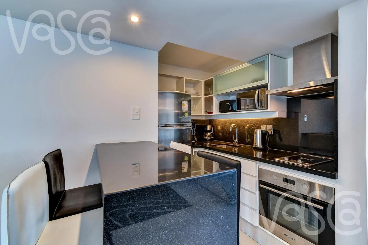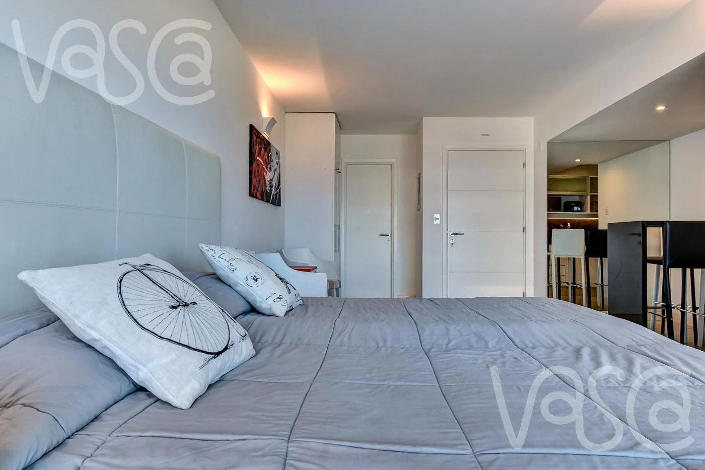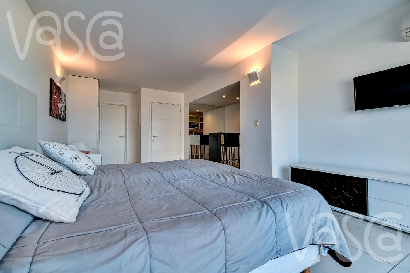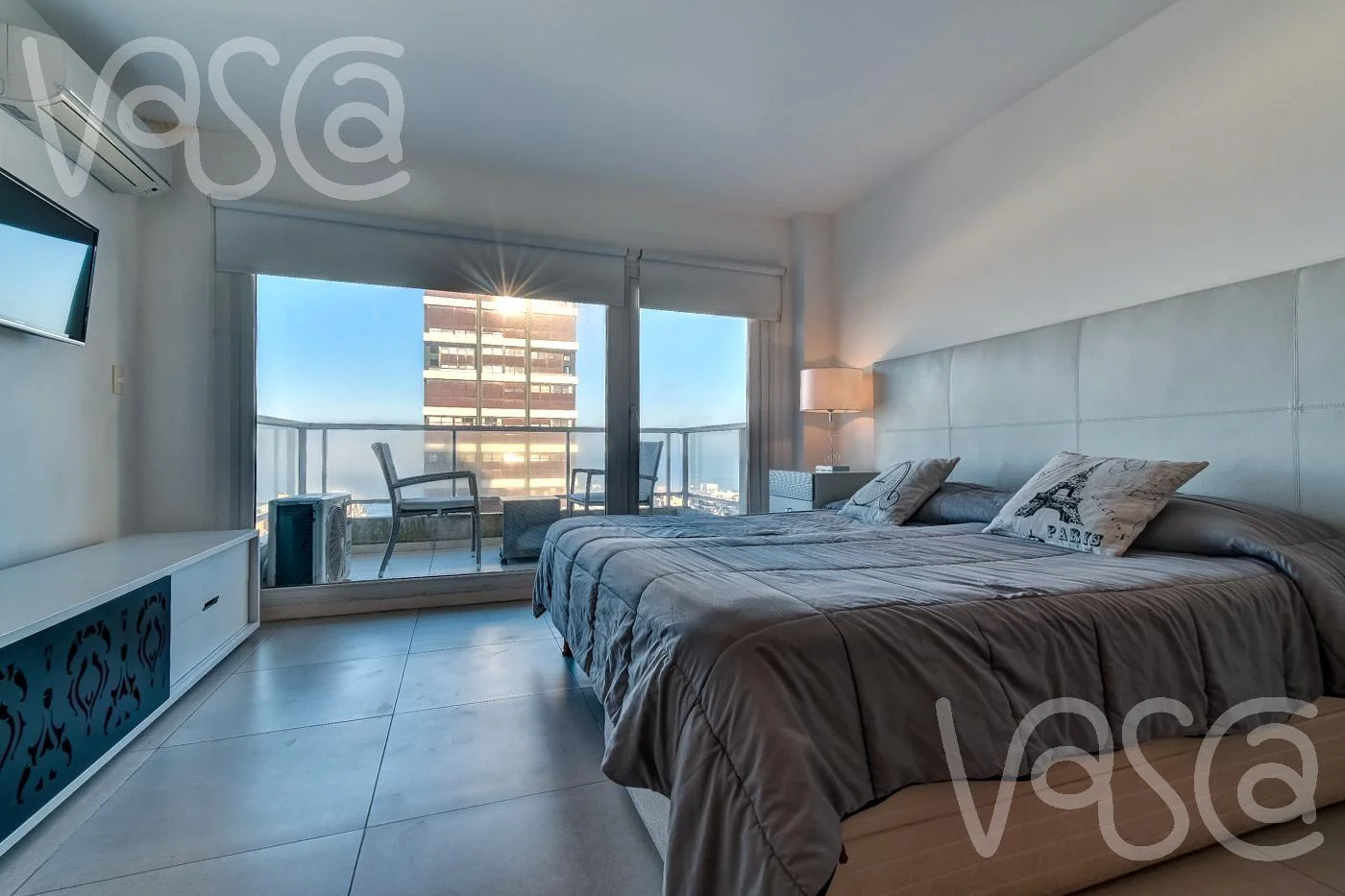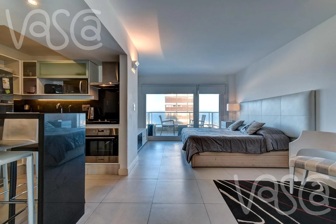 Ubicado en plena península y con vista al mar, se encuentra este amplio monoambiente completamente equipado a nuevo. Con vista al mar bravo desde la cama, cuenta con muy linda cocina con barra desayunador, sector de living, sector de dormitorio con gran cama King size y balcón.