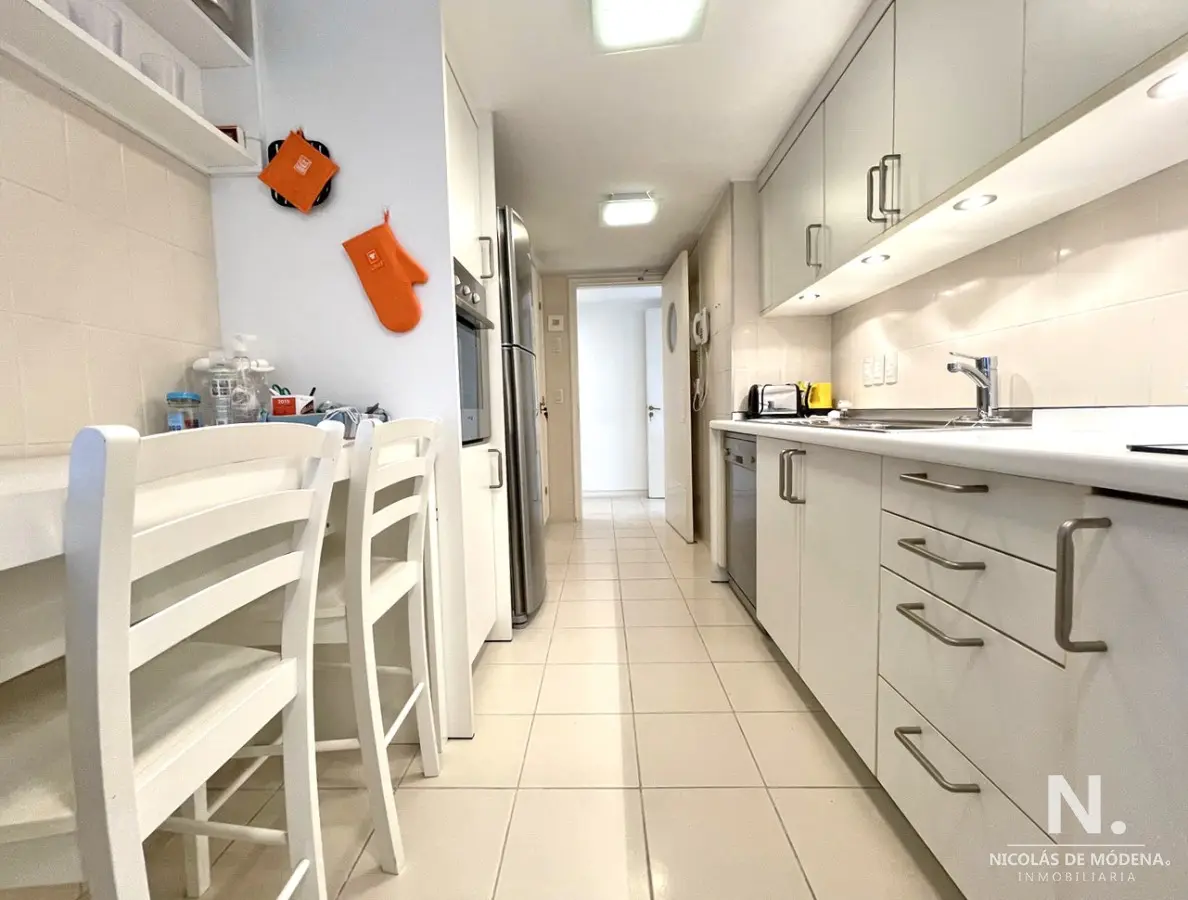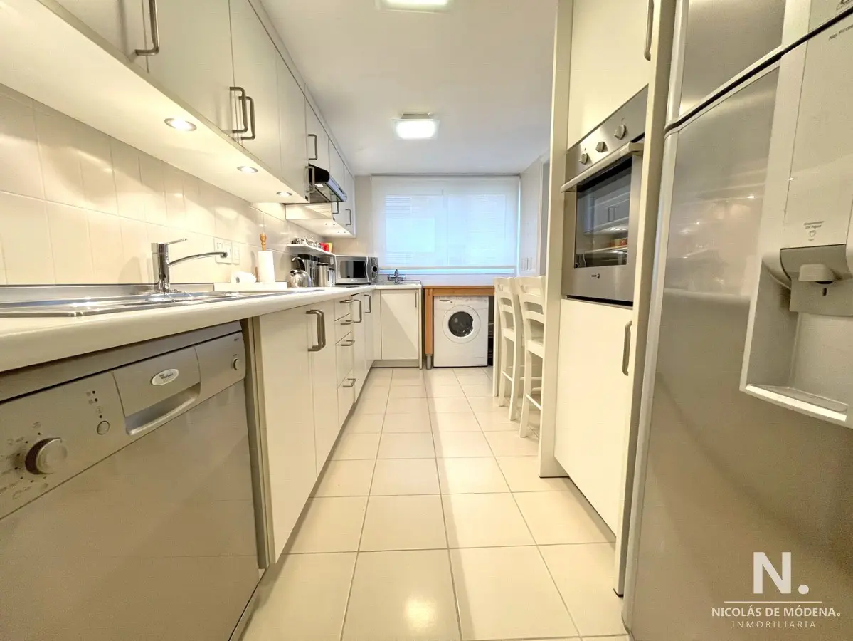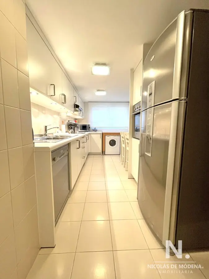 El apartamento está completamente equipado con todas las comodidades modernas, incluyendo anafe, microondas, lavarropas, lavavajillas, heladera con freezer, licuadora, cafetera, aire acondicionado, smart TV y más. Además, cuenta con armarios empotrados en los dormitorios y la cocina, una campana extractora, horno, bañera y bidet en los baños, asegurando el máximo confort y conveniencia para los residentes.