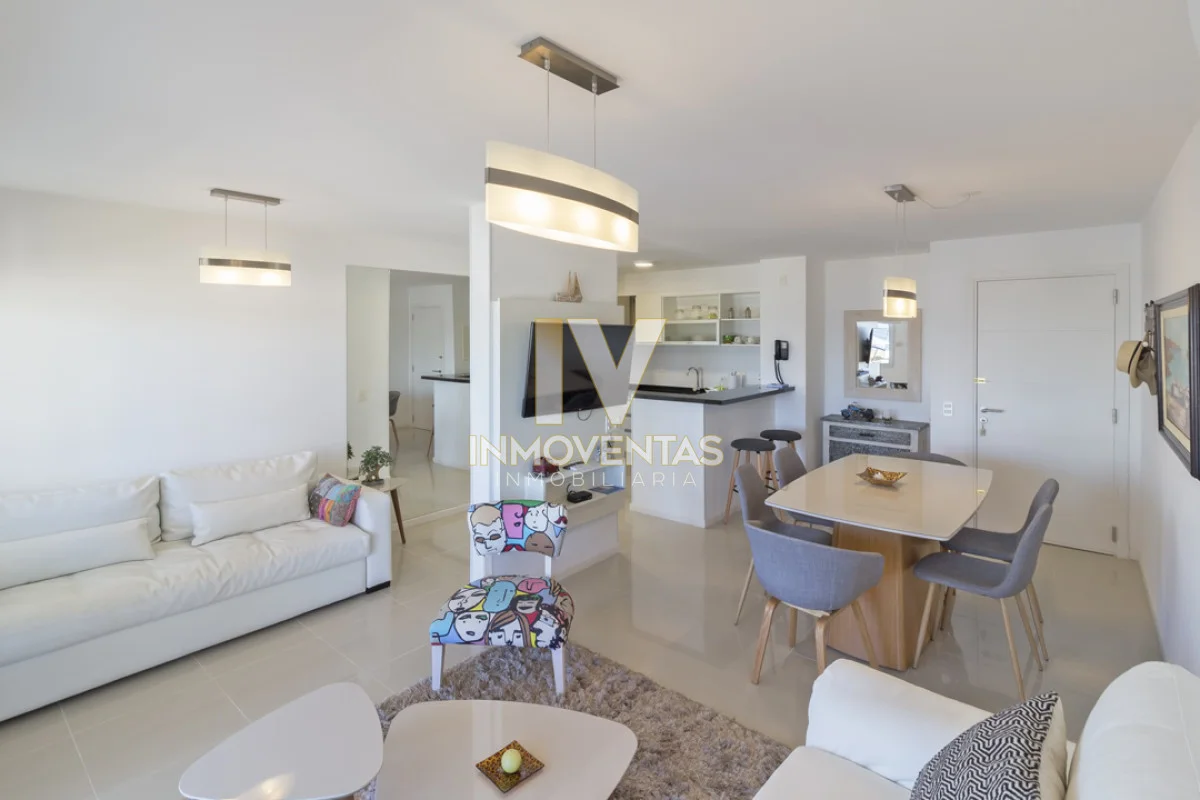 Living comedor con terraza, dos dormitorios, suite, cocina integrada y cochera.