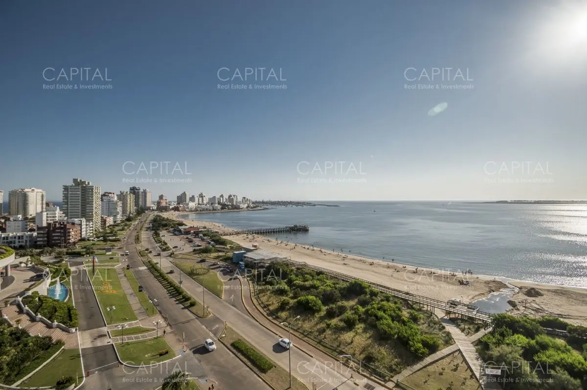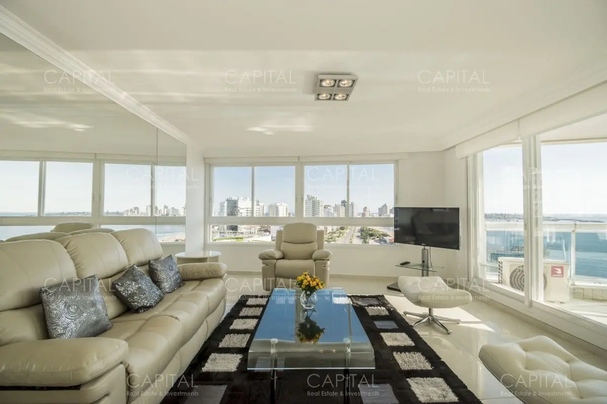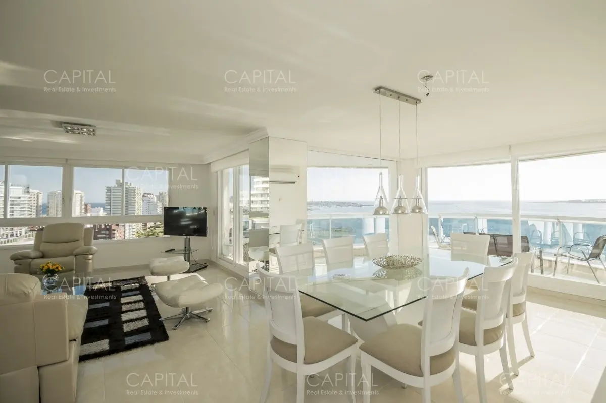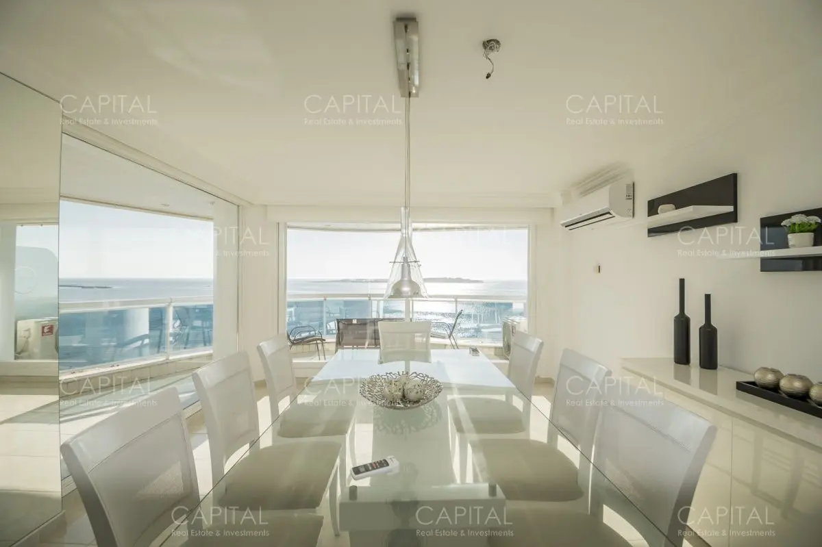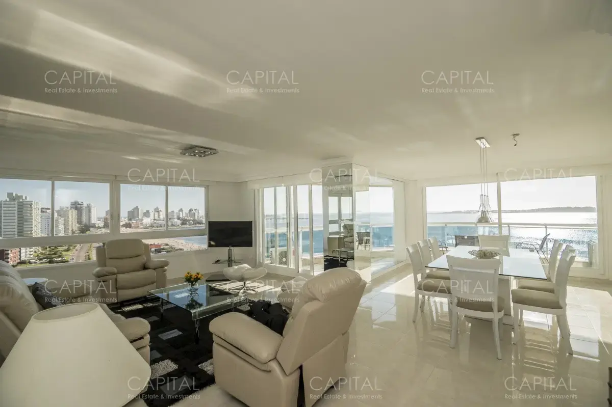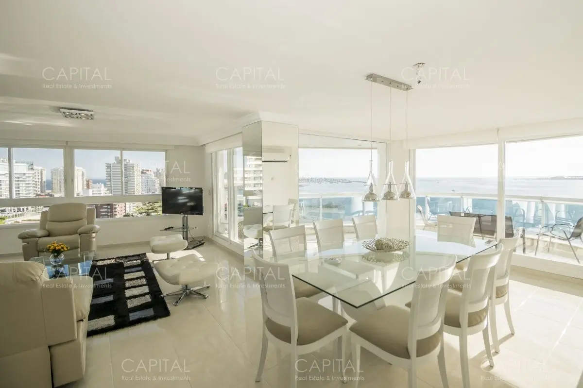 Apartamento de primer nivel en Playa Mansa, Punta del Este, living comedor amplio con vista al mar y el atardecer