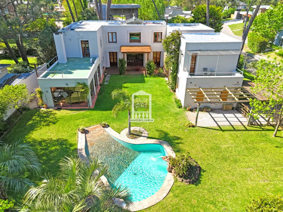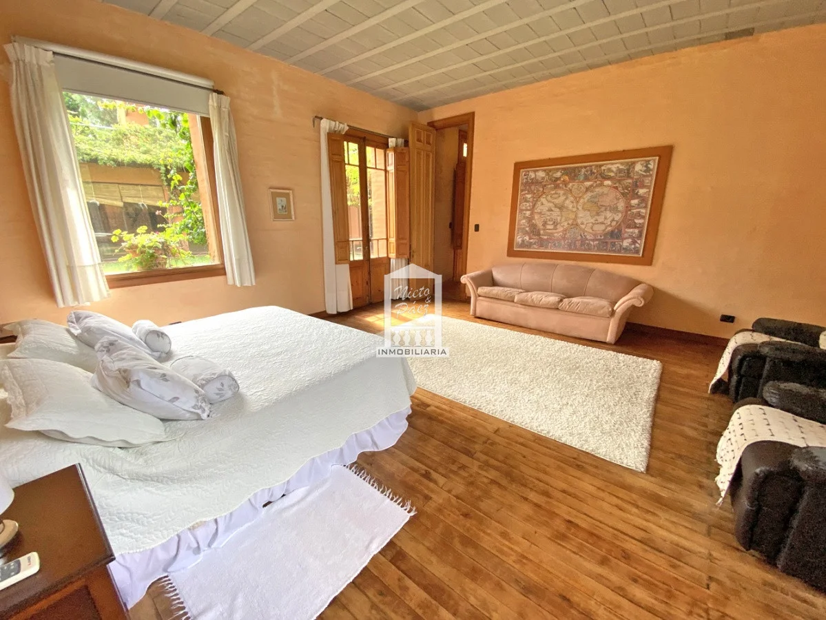 Jardín completamente cercado, pileta, casa de servicio o casa de huéspedes y cochera para 2 autos, estacionamiento para 4 autos más.