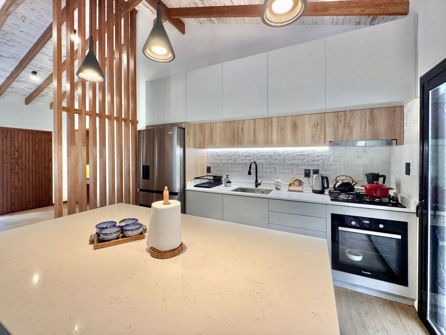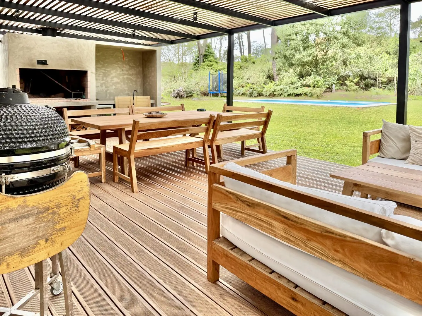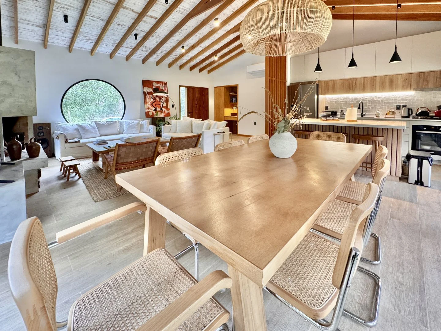 Living comedor con cocina integrada y salida a la galeria con su parrillero. Acogedor jardin con piscina.